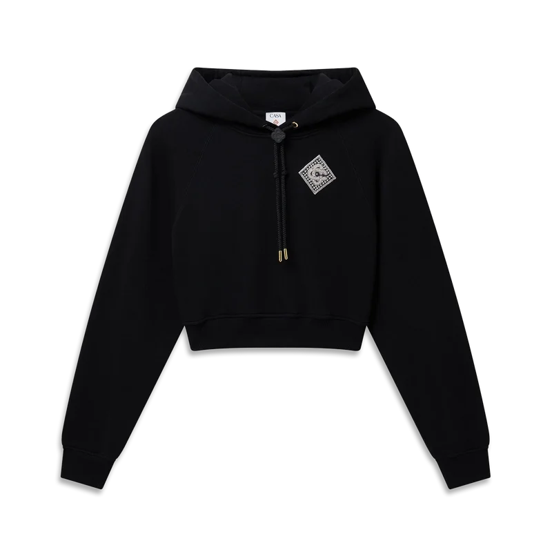 Het Pearl Diamond Cropped Hooded Sweatshirt is een verfijnd sportkledingontwerp, vervaardigd uit biologisch katoen. Afgewerkt met een capuchon met vergulde oogjes, een trekkoord met gouden uiteinden, een merk-toggle voor stevige sluiting, een parel- en kristal-diamantpatroon en geribde manchetten en zoom.