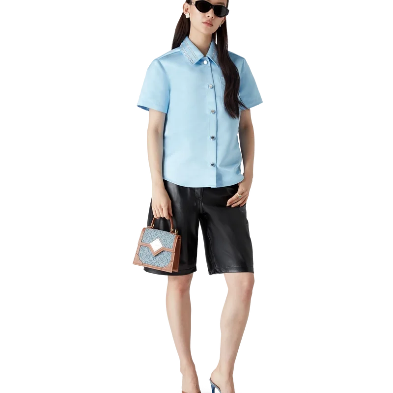 Het satijnen overhemd met korte mouwen is een klassiek ontwerp, vervaardigd uit satijn. Afgewerkt met knoopsluiting, vergulde knopen met merklogo, een puntkraag, een afgeronde zoom, een borstzakje en kralendetails op de kraag en het borstzakje.