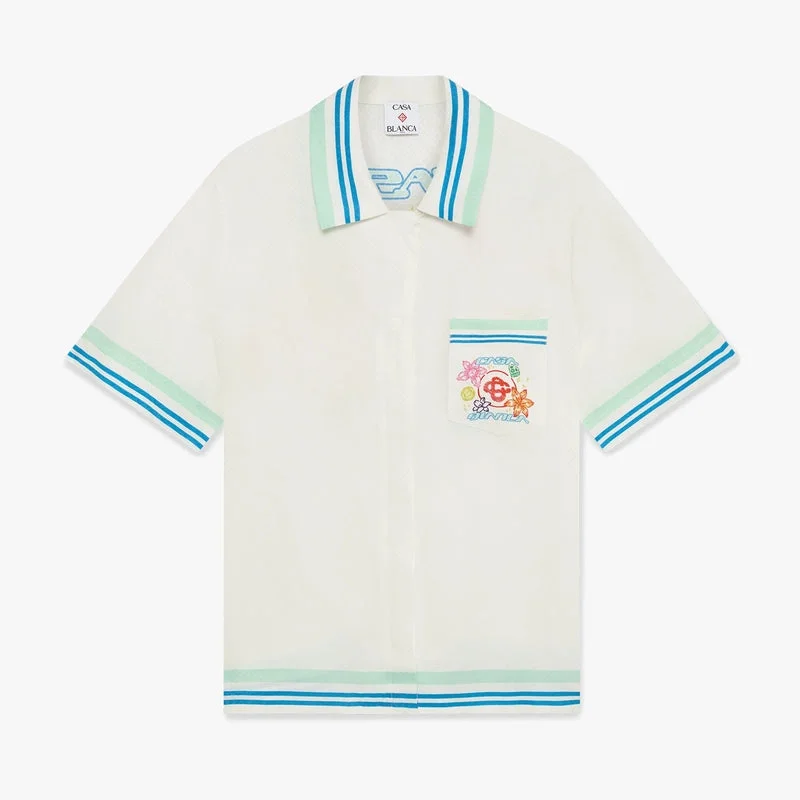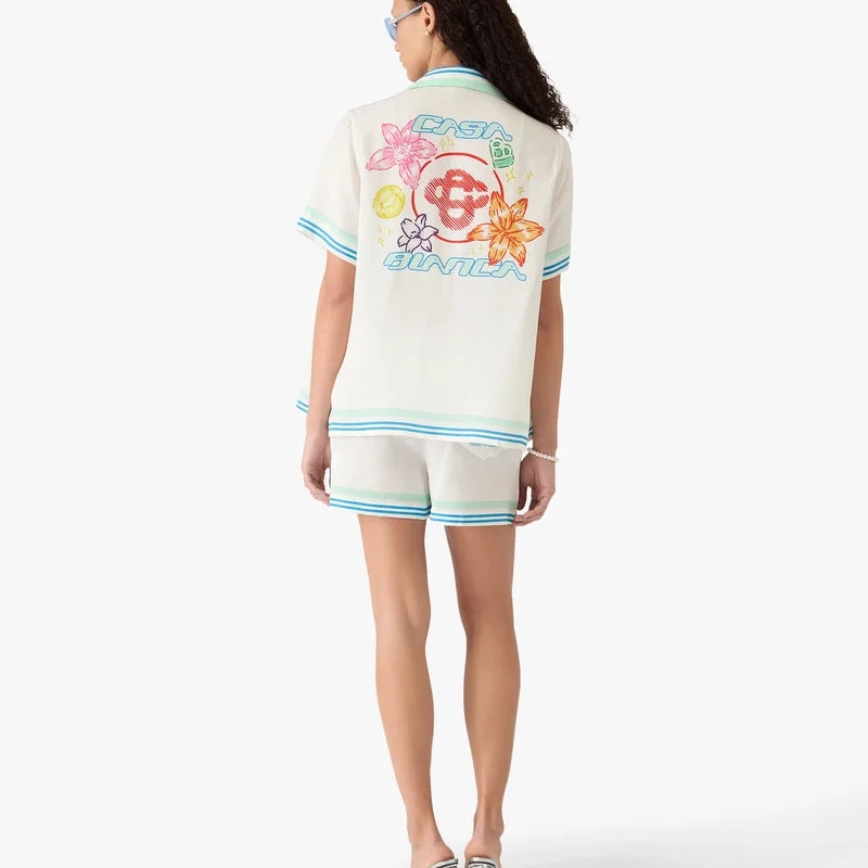 Het zijden overhemd met bloemenprint, Cubaanse kraag en korte mouwen heeft een print met de grafische collage-illustraties van dit seizoen, met interpretaties van het logo, een smiley en een orchidee. Afgewerkt met een Cubaanse kraag, knoopsluiting, Corozo-knopen met het Cc-logo, een borstzakje en groene, blauwe en witte streepjes aan de randen van de kraag, manchetten, zoom en zak, in een relaxte pasvorm.