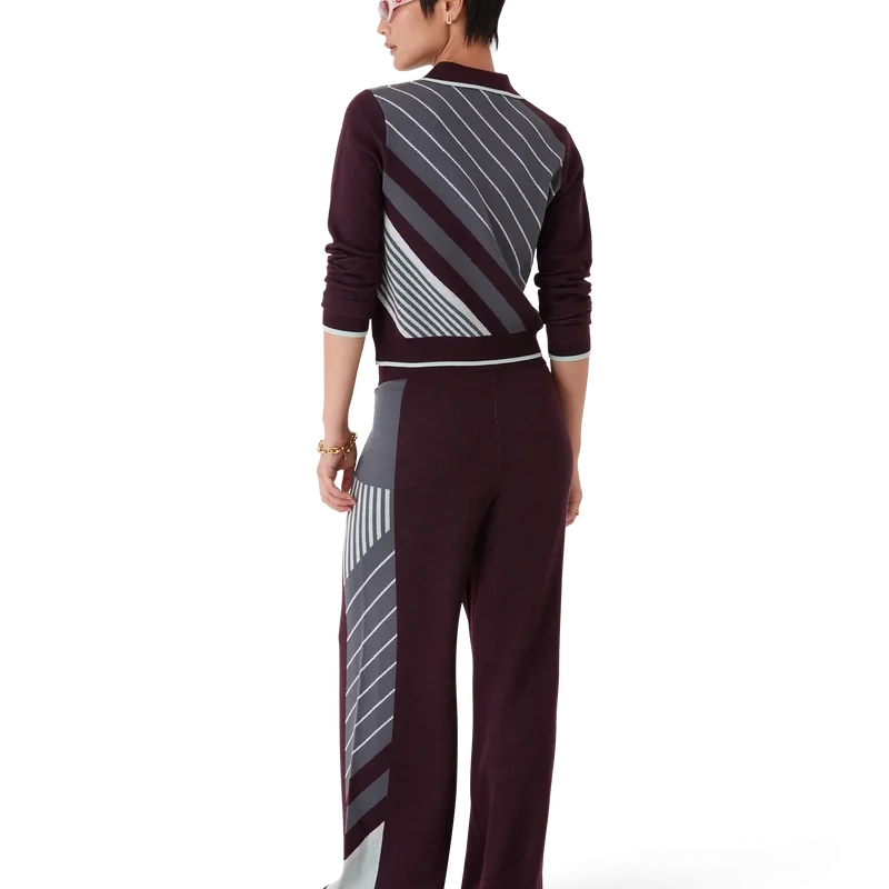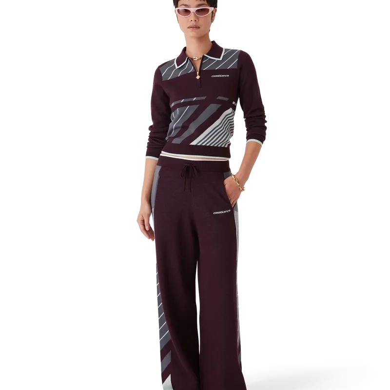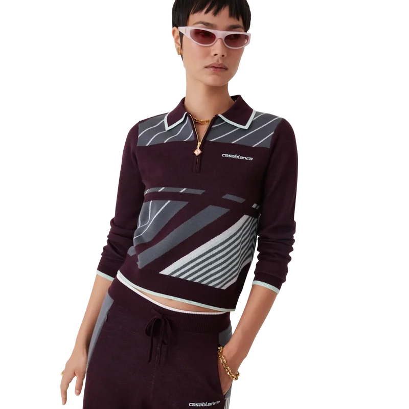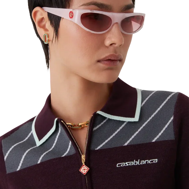 Het Diagonal Tennis Merino poloshirt met lange mouwen is een gebreid ontwerp met diagonale sportstrepen en een geborduurd Casablanca-logo. Afgewerkt met een kwartritssluiting met kenmerkend ritslipje met diamantlogo, een geribde kraag en contrasterende randdetails op de kraag en manchetten.