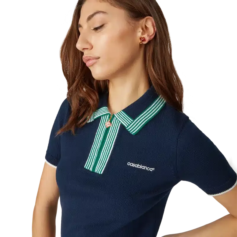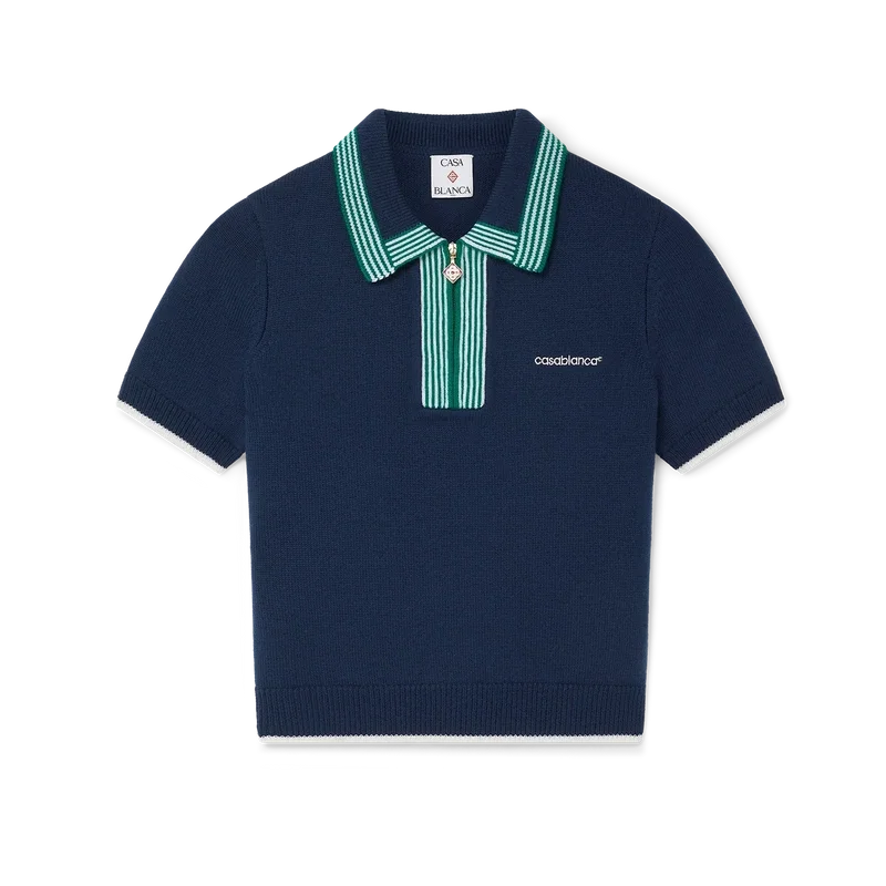 Het gebreide tennispoloshirt is een klassiek ontwerp, vervaardigd van merinowol. Afgewerkt met contrasterende geribde randen aan de manchetten, zoom, kraag en knoopsluiting, ritssluiting aan de voorkant, een geribde kraag en het Casablanca-logo.