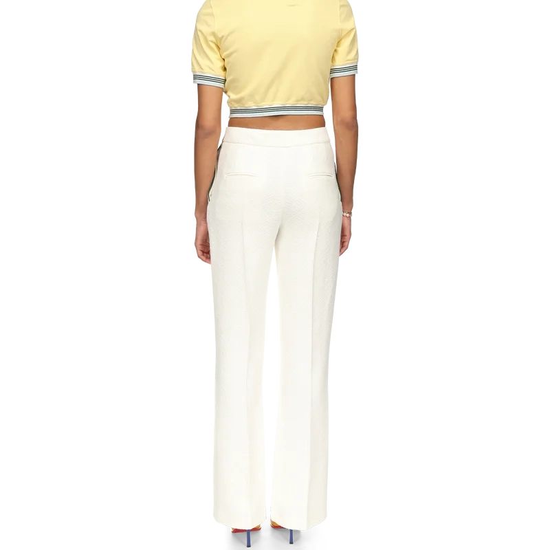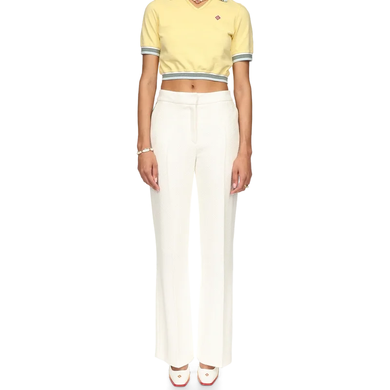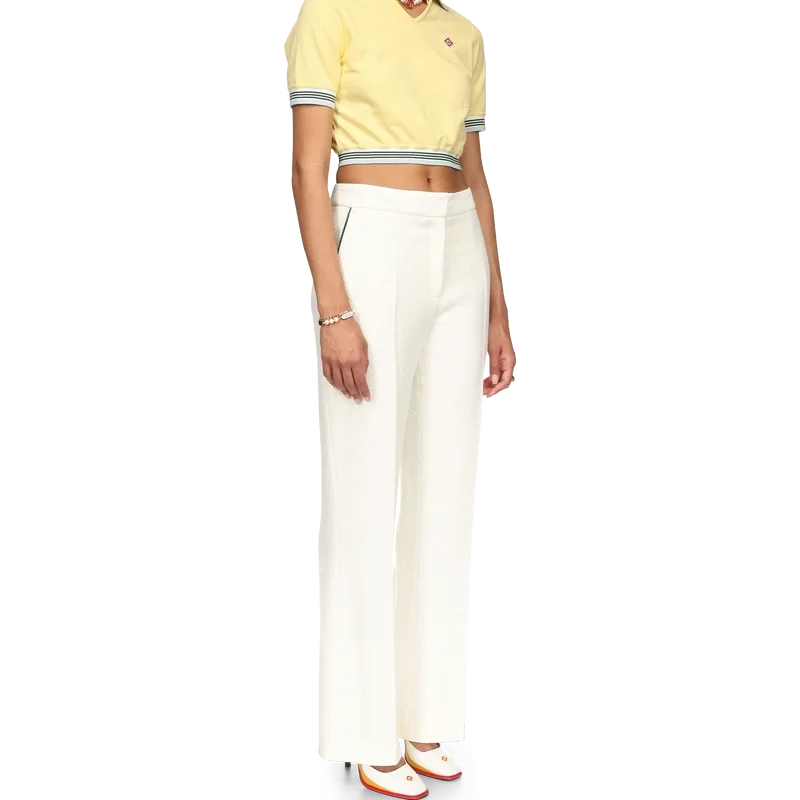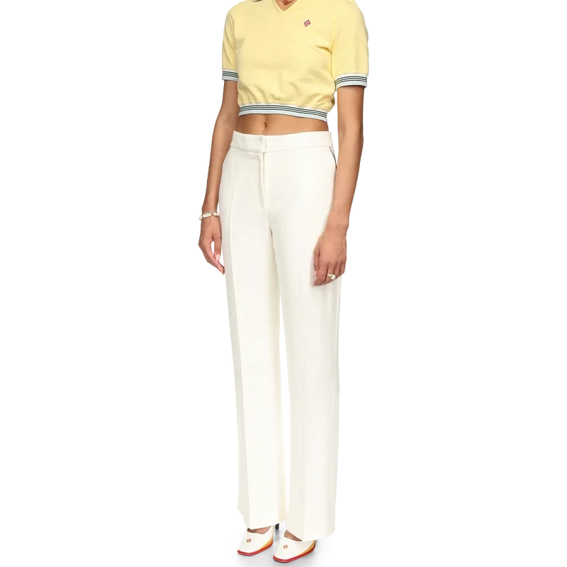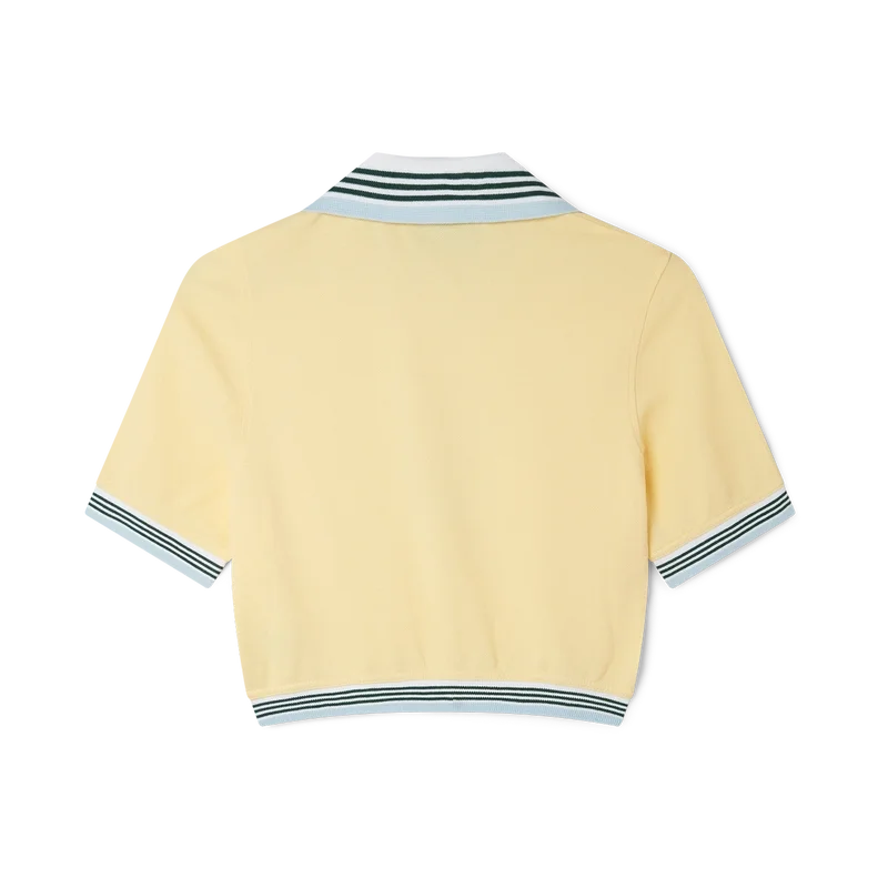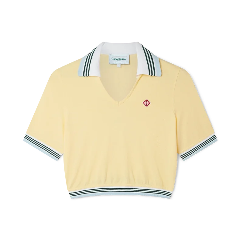 Het Cropped Pique Polo-shirt is een model met korte mouwen en V-hals, met een licht gerimpelde zoom. Gemaakt van 100% katoenpiqué, en afgewerkt met gestreepte ribboord aan kraag en manchetten, een Casablanca-merklabel en het diamantlogo van het huis.