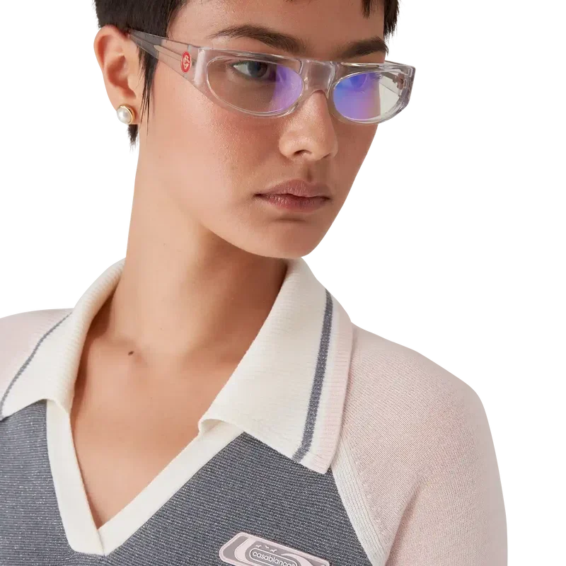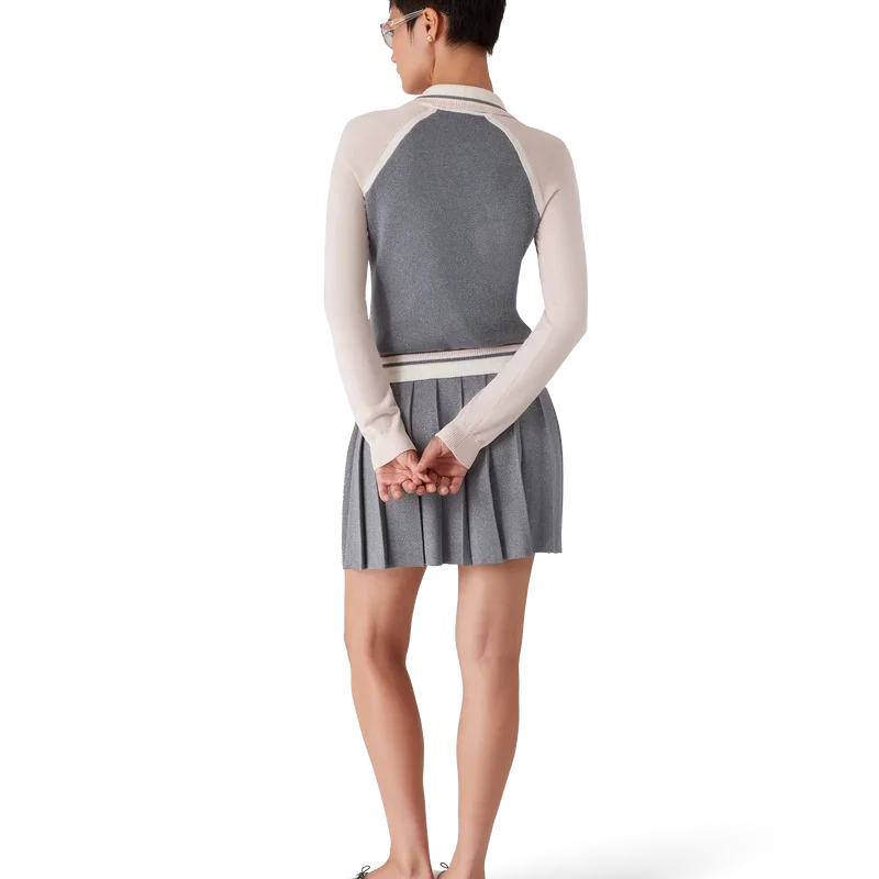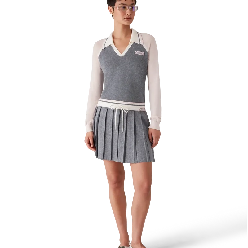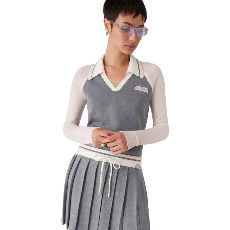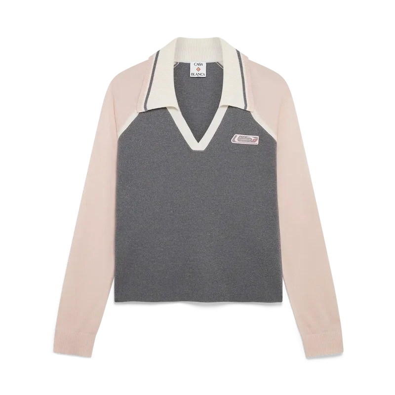 Het Merino Tennis-polo met lange mouwen is een gebreid ontwerp met het siliconen logo-embleem van het huis. Afgewerkt met een geribde kraag met gestreepte rand, een V-hals en raglanmouwen met geribde rand.