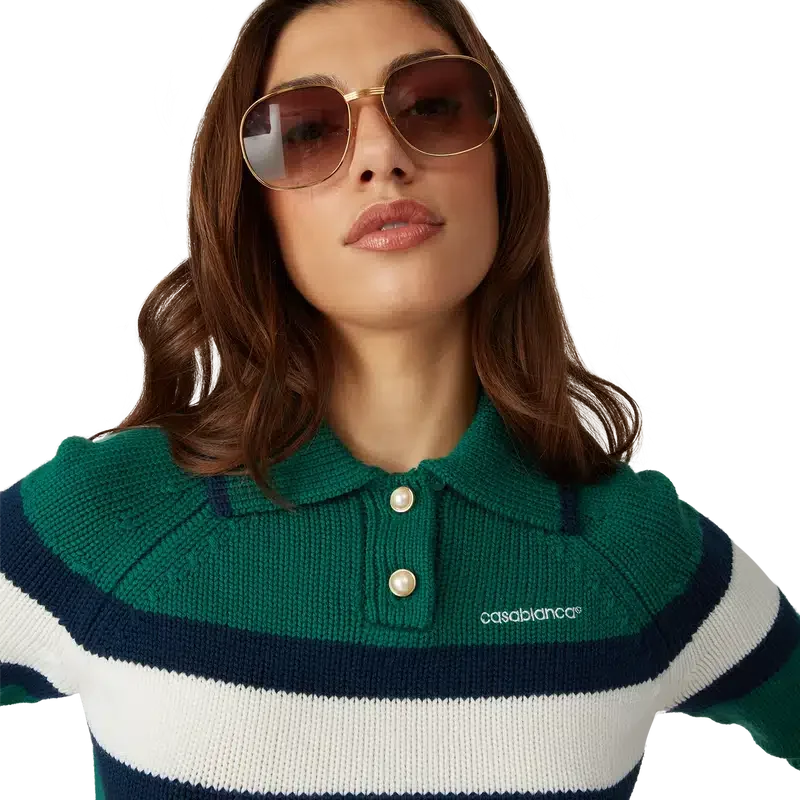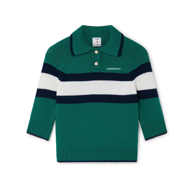 Het Colour Block-poloshirt is een kort model met lange mouwen, gemaakt van merinowol en voorzien van een blauw-witte streep over de borst en rug. Afgewerkt met raglanmouwen, geribde manchetten, zoom en kraag, kenmerkende parelknopen met gouden rand en het Casablanca-logo.<!–