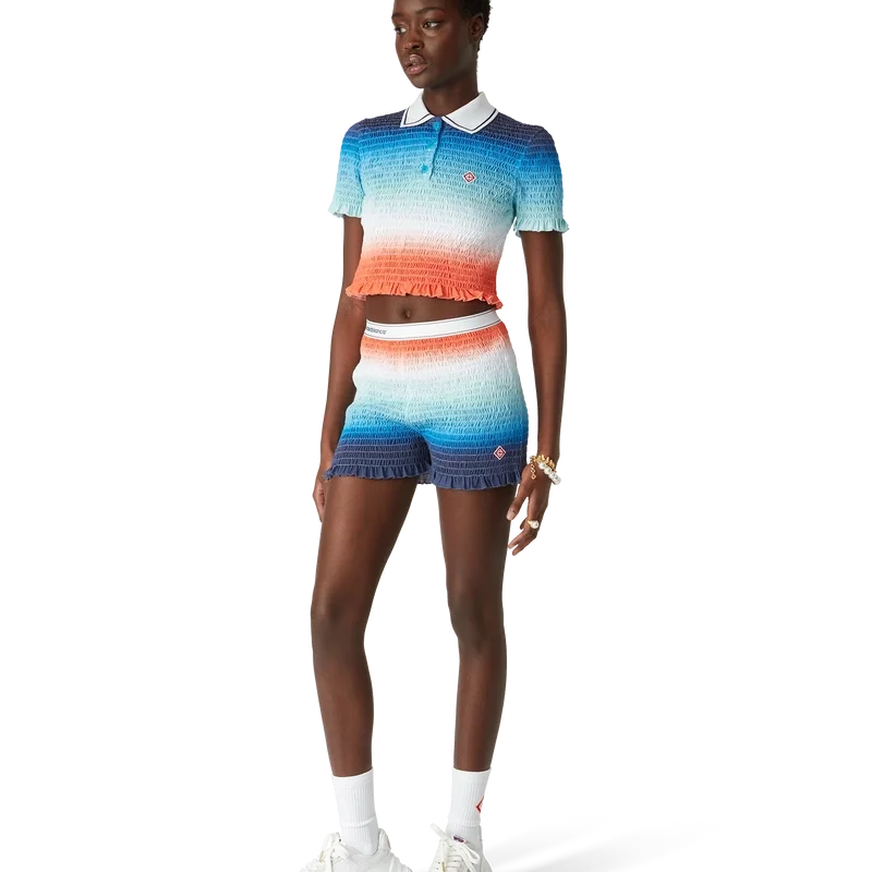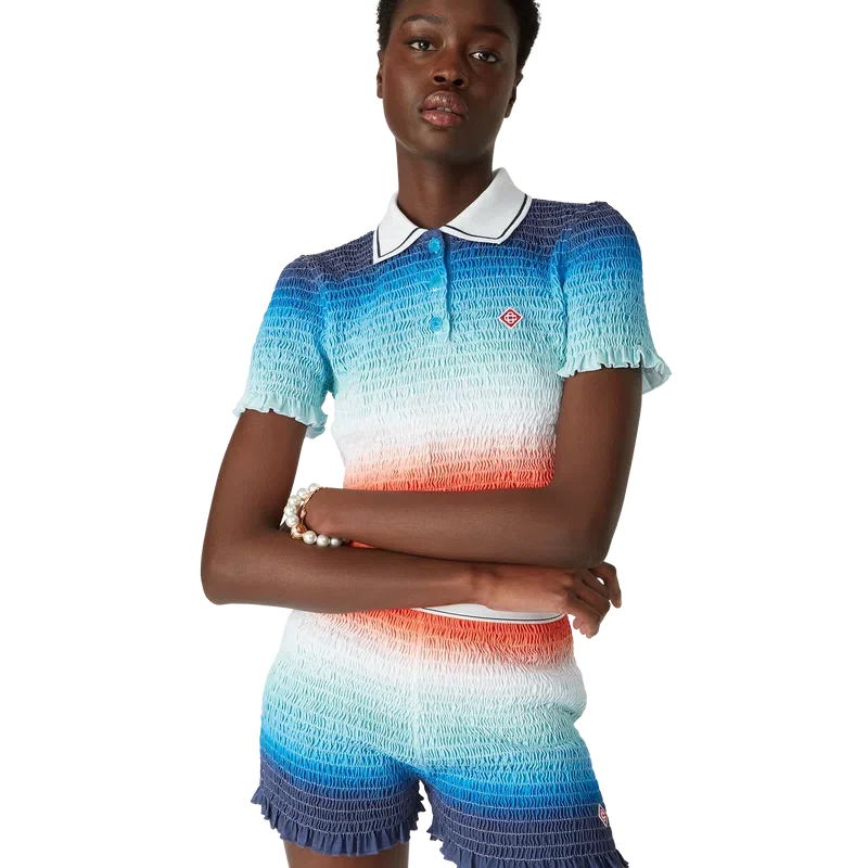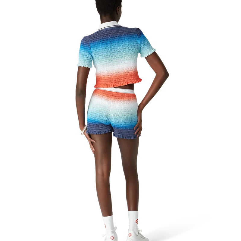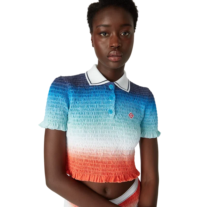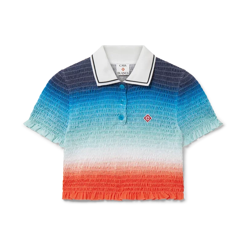 Het cropped poloshirt met kleurverloop is een kort model met all-over print, voorzien van het levendige seizoensgebonden kleurverloop van het huis: diep inktblauw dat overgaat in roze tinten naar levendig oranje, wat de veranderende zomerlucht weergeeft die wegzakt in de horizon van de oceaan, verwijzend naar het steeds veranderende canvas van de natuur, en het kenmerkende diamantlogo van het huis.