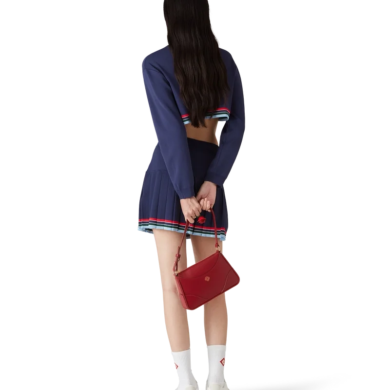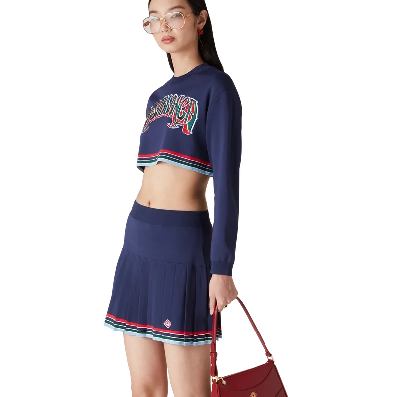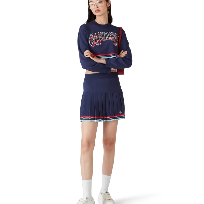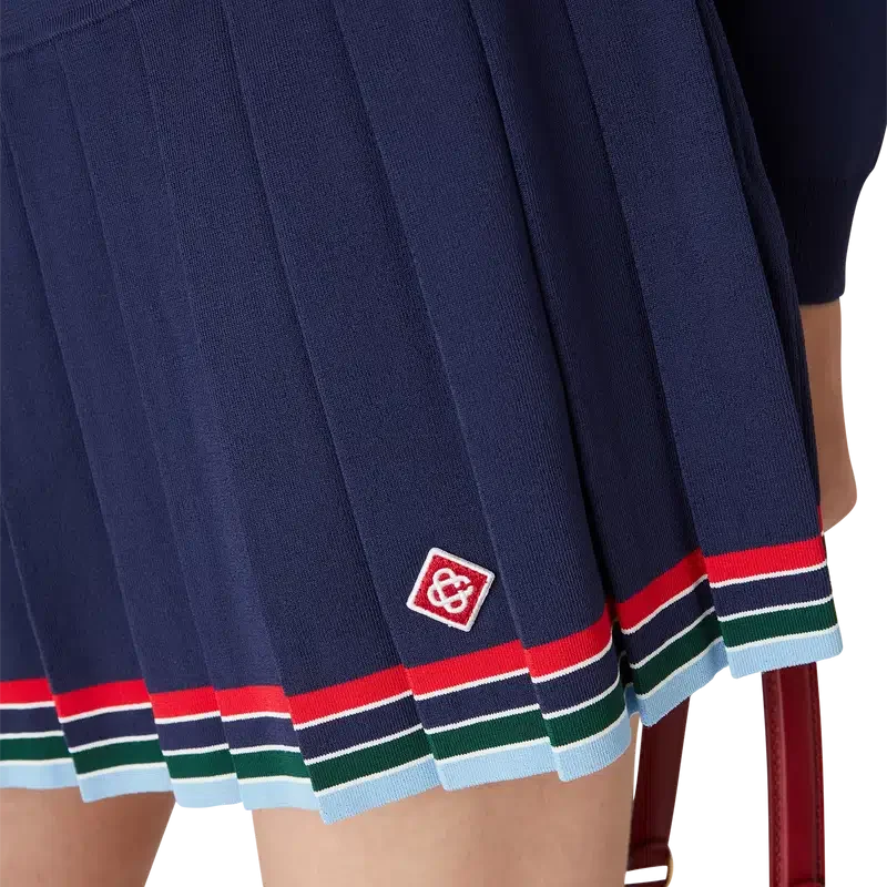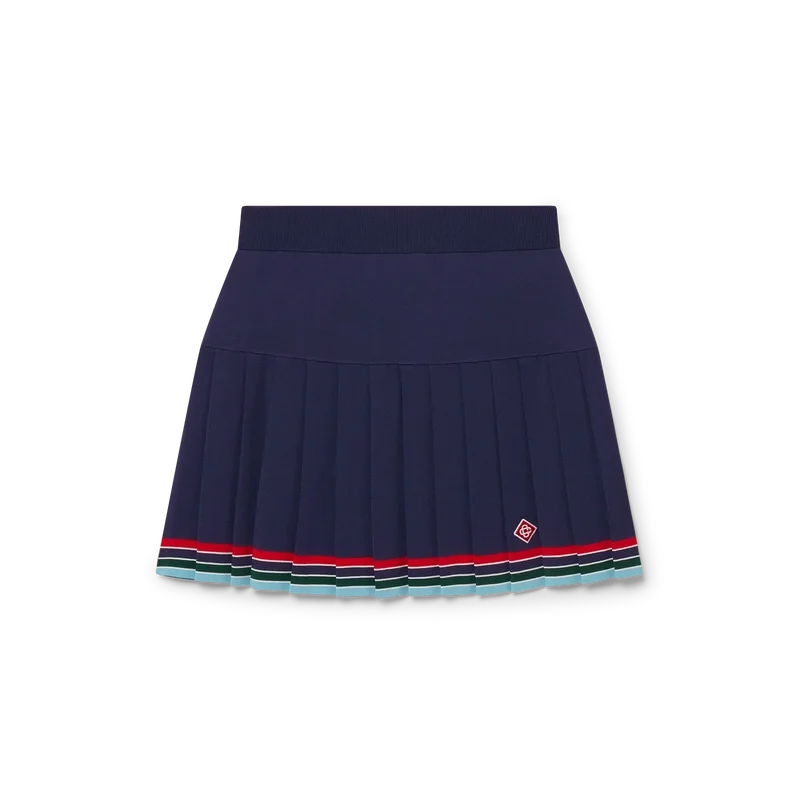 De Baseball-plooirok is een mini-model, vervaardigd van tricotstof. Afgewerkt met een tailleband, plooien en een detail van horizontale strepen in rood, wit, blauw, groen en marineblauw aan de zoom.