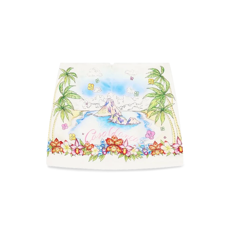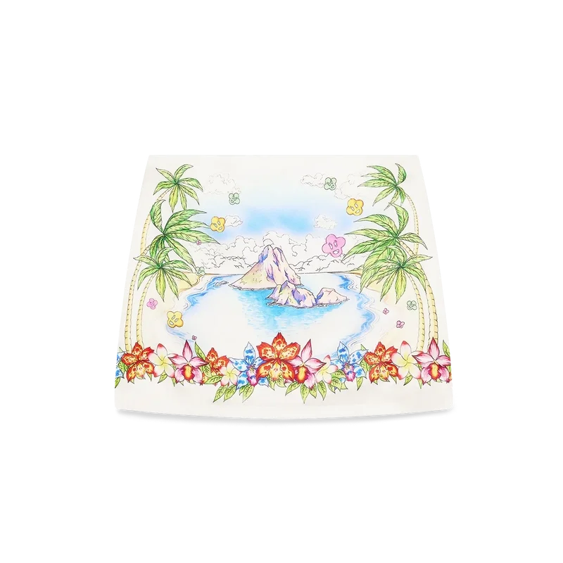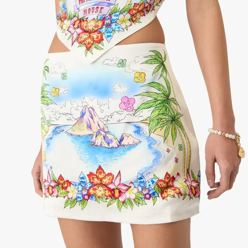 De Better Days zijden satijnen minirok is een verfijnd A-lijnontwerp met de Better Days-illustratie van dit seizoen, die de utopische visie van Ibiza beschrijft als een bestemming voor een bijna religieuze ontdekkingsreis door het diverse muzikale landschap. Afgewerkt met een ritssluiting, in een slank silhouet – ontworpen om te dragen met de bijpassende sjaaltop.