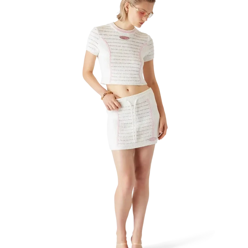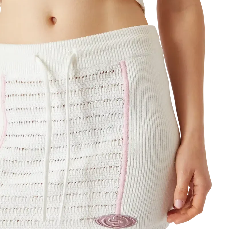 Het Bourgeoisie Girl-rok is ontworpen met een licht A-lijn zoom en voorzien van het Warped-logo van het huis in een glasachtig effect. Het kledingstuk is ontworpen om te worden gedragen met de bijpassende Bourgeoisie Girl-top en weerspiegelt een nauwkeurige constructie met een verfijnde sport-leisure-uitstraling. Afgewerkt met een elastische tailleband, trekkoordsluiting, contrasterende stiksels en geribde zijpanelen.