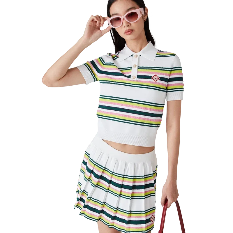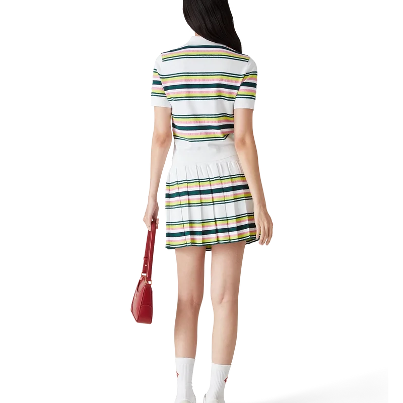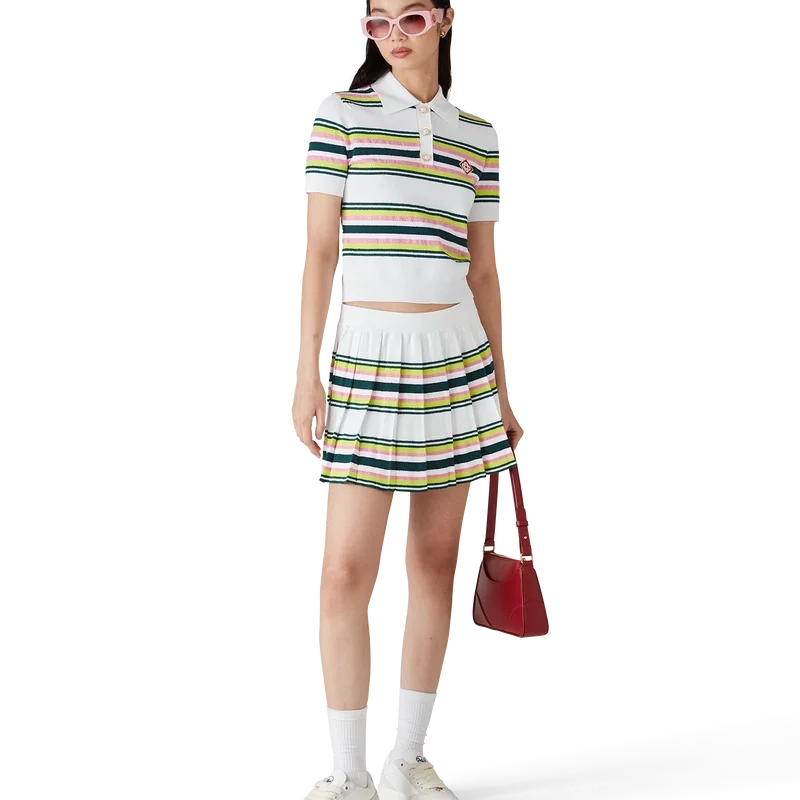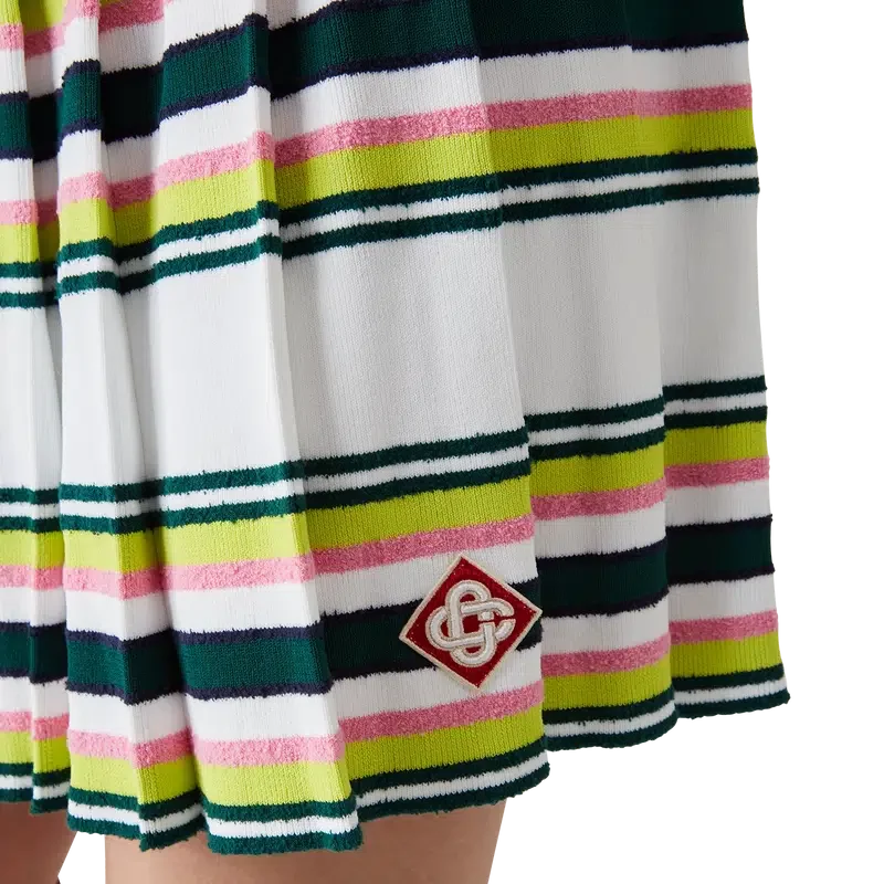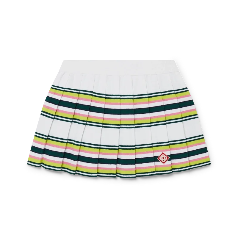 De gestreepte plooirok is een mini-model gemaakt van een gestreepte stof. Afgewerkt met een elastische tailleband, plooien, groene, roze en blauwe horizontale strepen, ritssluiting aan de zijkant en een nauwsluitend broekje.