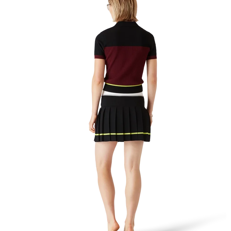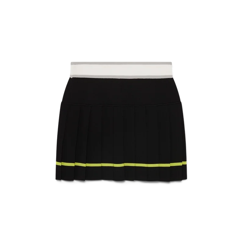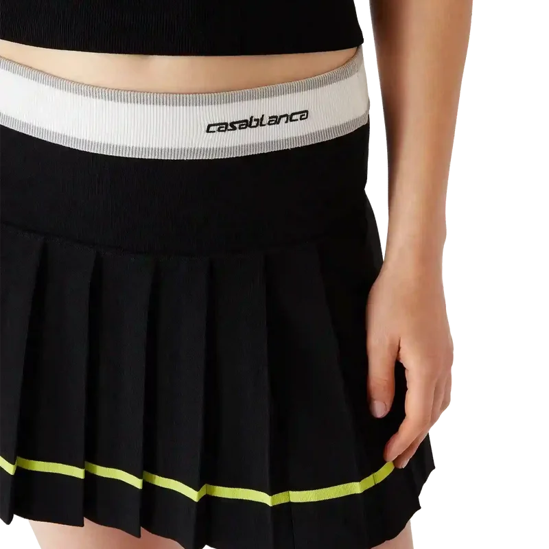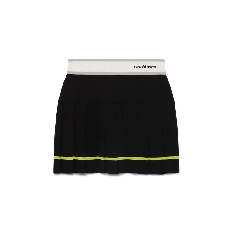 Het gestreepte plooirok is een mini-model met een gestructureerd silhouet dat de atelierbenadering van het huis ten aanzien van sportkleding weerspiegelt. Afgewerkt met een elastische tailleband met het Casablanca-logo, een effen pas en een geplooid paneel met gele streepjes aan de zoom.