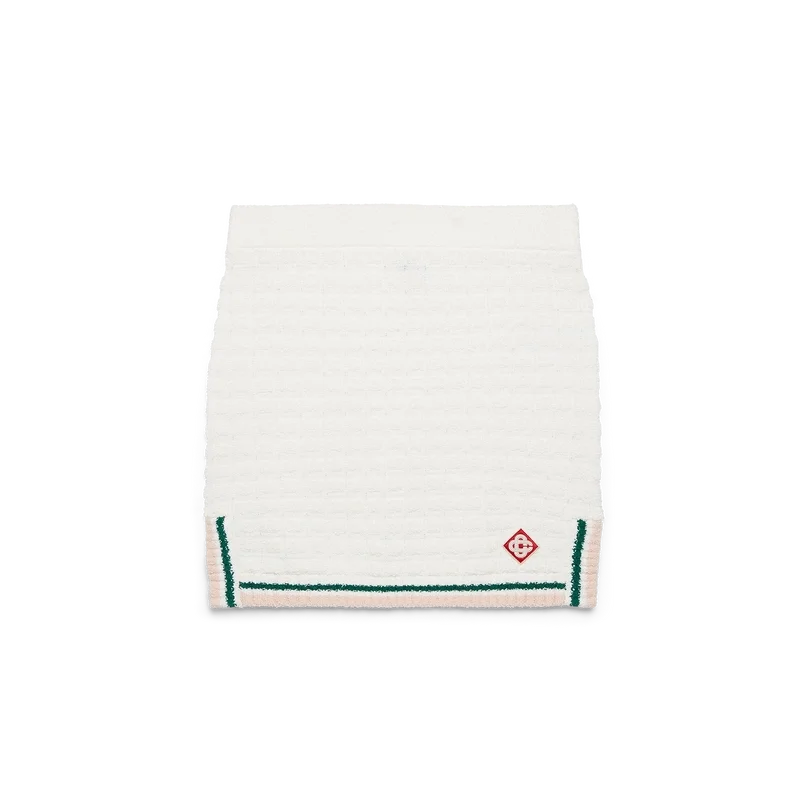 Het katoenen bouclé minirok is een gebreid ontwerp, vervaardigd van katoenen bouclé-stof en voorzien van het kenmerkende diamantlogo van het huis. Afgewerkt met een elastische tailleband, een geribde zoom en zijsplitten met roze, witte en groene streepjes.