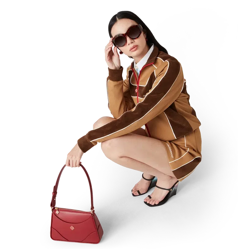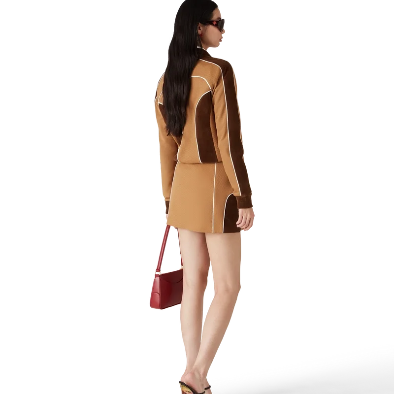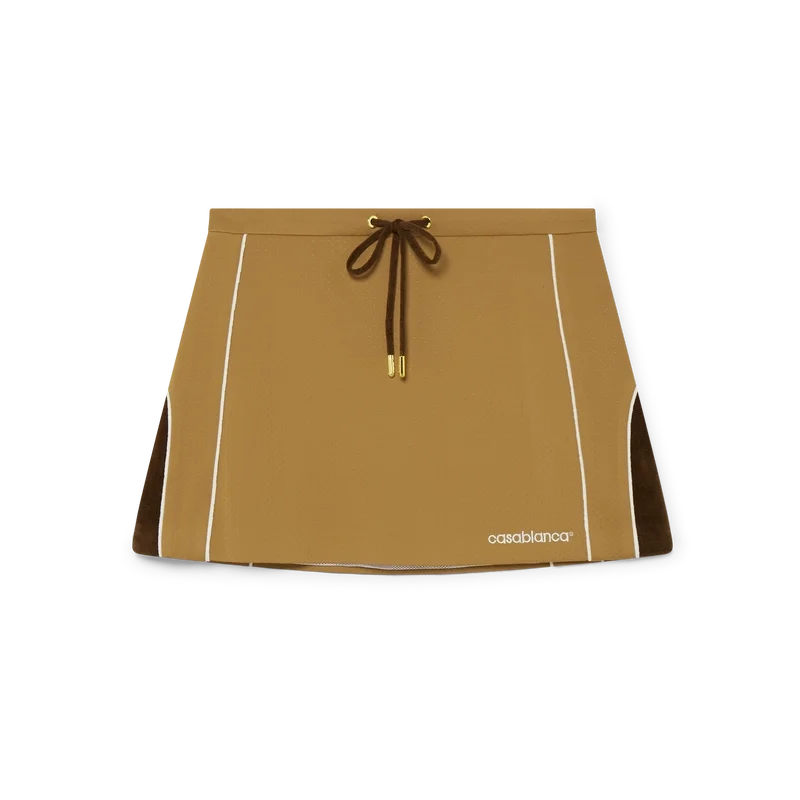 De mini-rok met chenille-panelen is een op sportkleding geïnspireerd ontwerp, vervaardigd van technische veloursstof en voorzien van het Casablanca-logo van het huis. Afgewerkt met een elastische tailleband, een trekkoord met gouden uiteinden en zijpanelen met witte biezen.