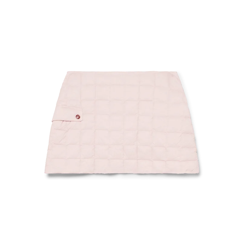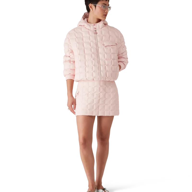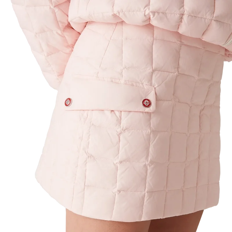Het nylon gewatteerde minirok heeft een A-lijn model met een vierkant gewatteerd patroon. Afgewerkt met een ritssluiting en een klepzak met de in elkaar grijpende, vergulde, geëmailleerde platte drukknopen van het huis.