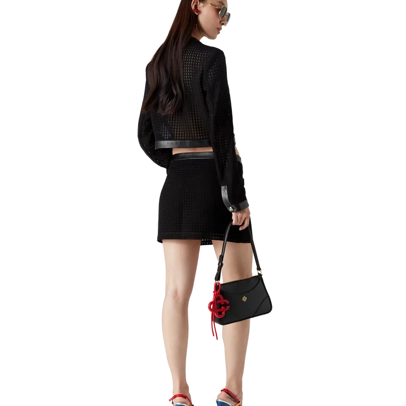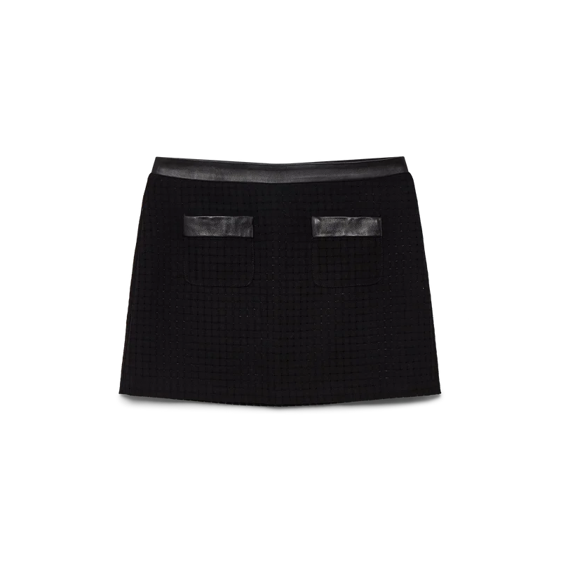 De op maat gemaakte minirok met open weefsel heeft een A-lijnontwerp en is vervaardigd van Cordonetto-stof. Afgewerkt met ritssluiting, opgestikte zakken en lederen afwerking op de tailleband en zakken.