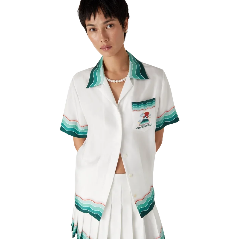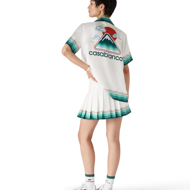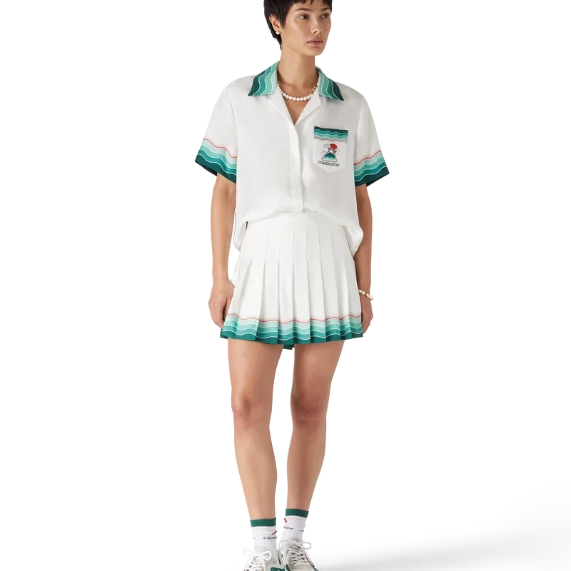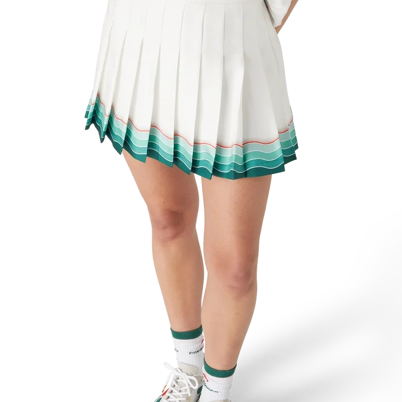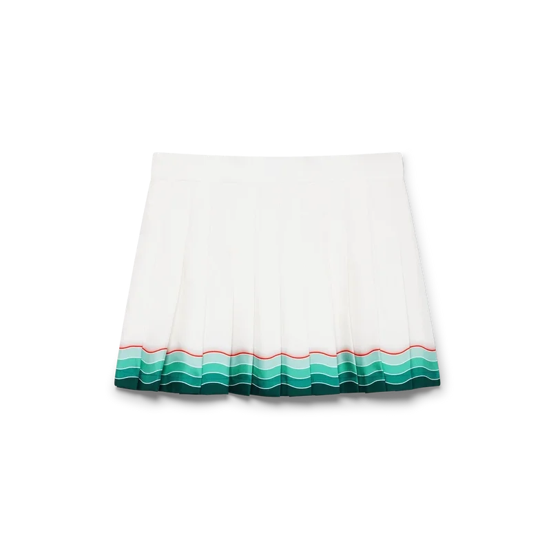 De Tennis geplooide zijden minirok is een klassiek ontwerp, vervaardigd van zijden twill. Afgewerkt met een tailleband, een ritssluiting, een voering en een door de Memphis-golf geïnspireerd detail met een kleurverloop in de zoom.
