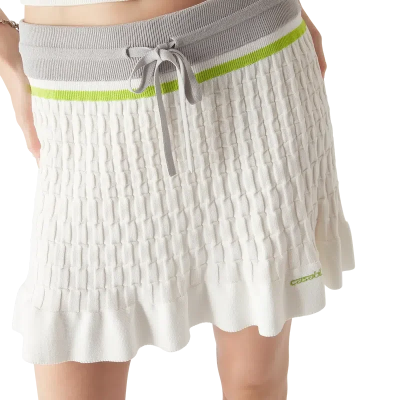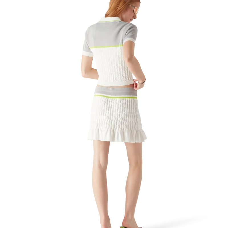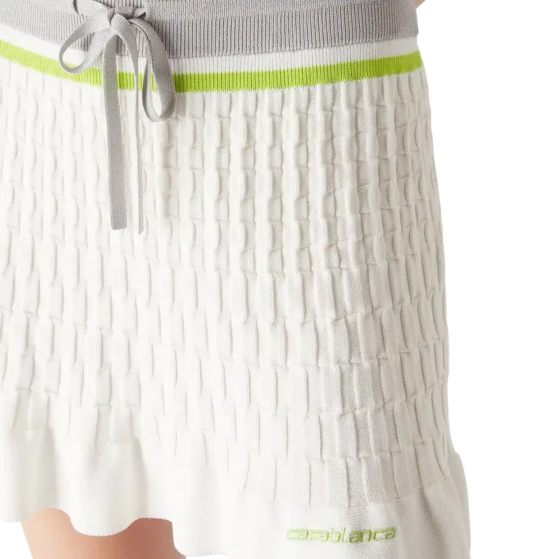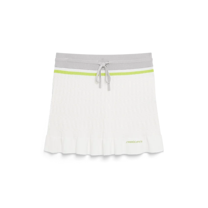 Het Tennis-minirok is een gebreid model met het Casablanca-logo van het huis. Afgewerkt met een elastische tailleband, een trekkoordsluiting en een zoom met vullende details, een ritssluiting met het kenmerkende diamantlogo van het huis op het ritslipje, een hoge kraag, gestreepte details, het kenmerkende Casablanca-logo, geribde manchetten en een zoom met ruches.