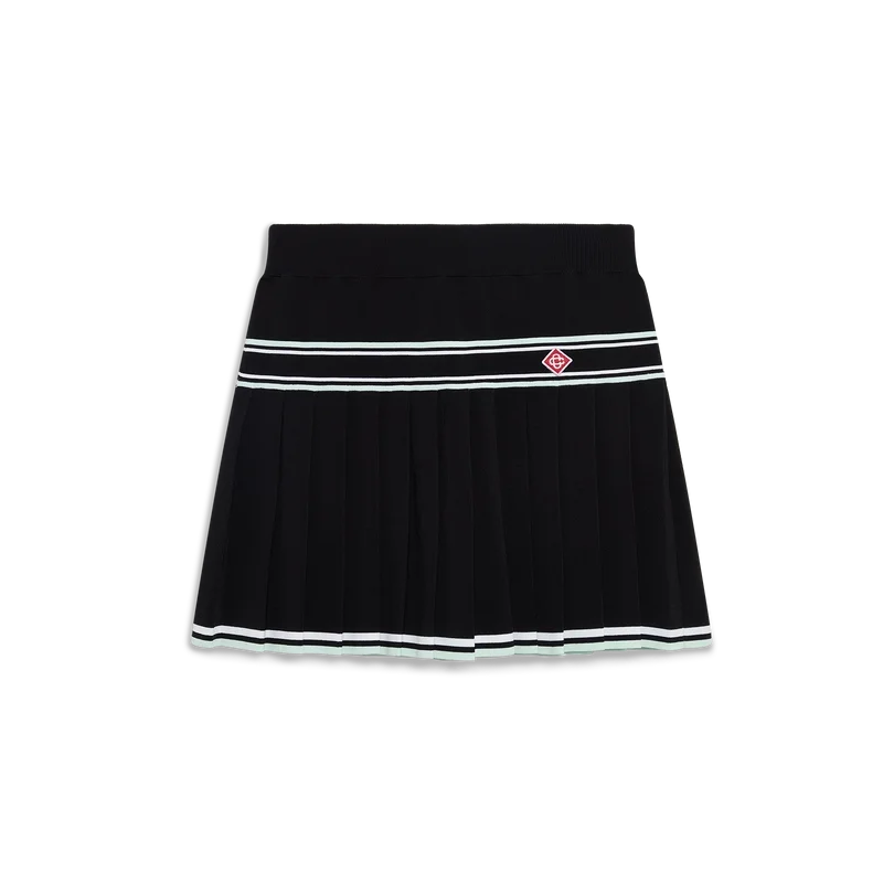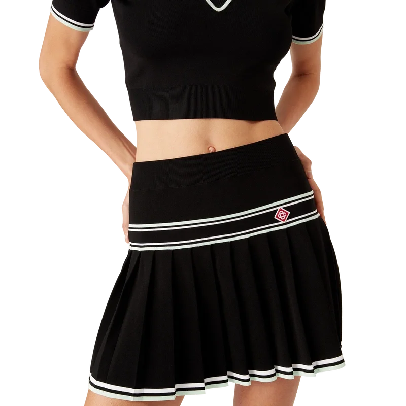 De viscose geplooide minirok is een kort model, vervaardigd uit viscose. Afgewerkt met een pas met gestreepte details en een geplooid paneel met horizontale strepen aan de zoom.