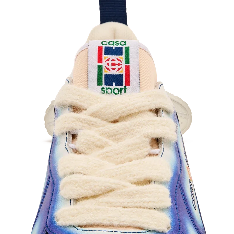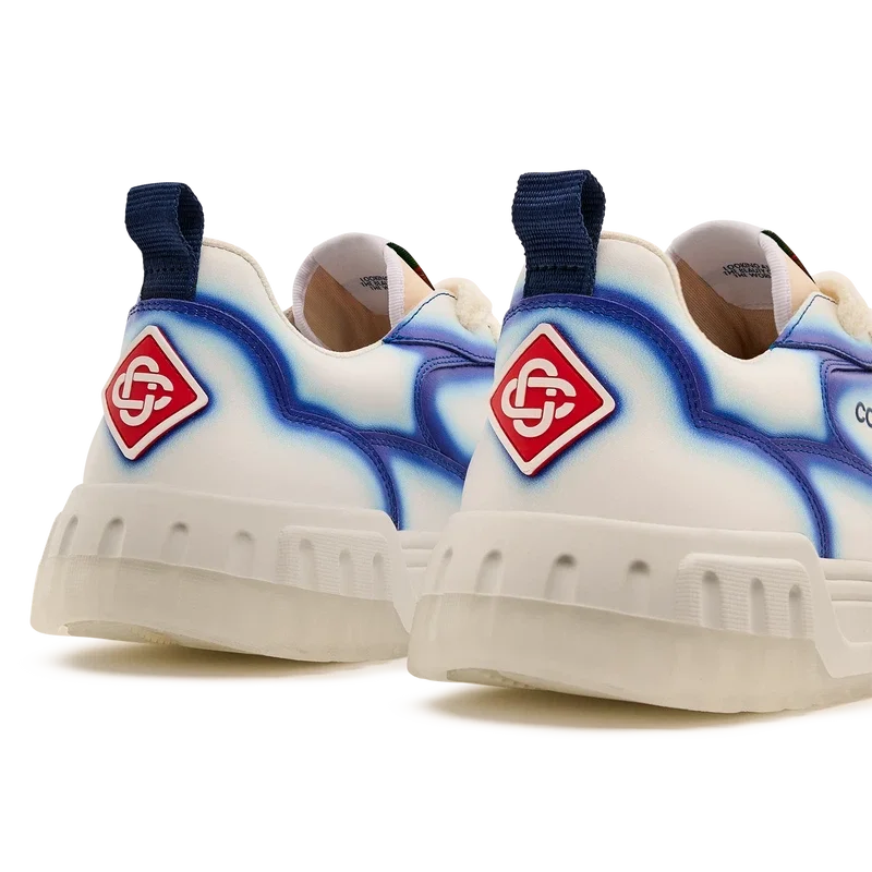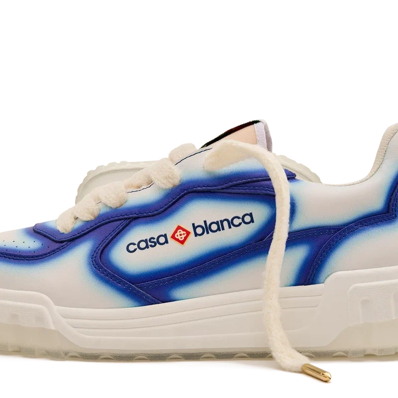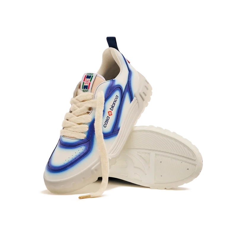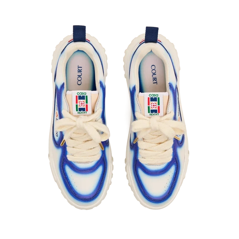 De ontwerptaal van de Court Sneaker weerspiegelt de iconische silhouetten van de jaren 90. De kleuren op de rubberen zool zijn een combinatie van de verfijnde codes van tennis en klassieke architectuur en creëren een uniform kleurenpalet over de hele schoen, waarbij de nadruk ligt op primaire kleuren die worden gecompenseerd door tenniswit om een sportief kleurverhaal te creëren. Het bovenwerk van de schoen is voorzien van geïntegreerde, vloeiende paneellijnen als knipoog naar de iconische silhouetten van de jaren 90. De prominente Casablanca-branding is overal duidelijk zichtbaar, inclusief het kenmerkende diamantmotief van het merk op de hiel, de siliconen woordmarkering op de zijkant en het geweven tonglabel en de binnenzool met tennisbaanmotief, waaraan de schoen zijn naam, de Court, te danken heeft.