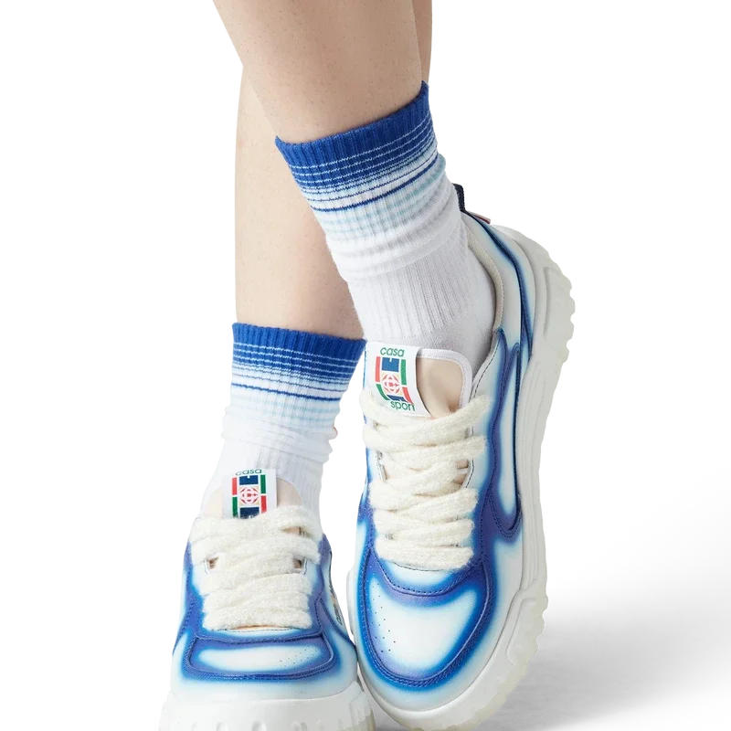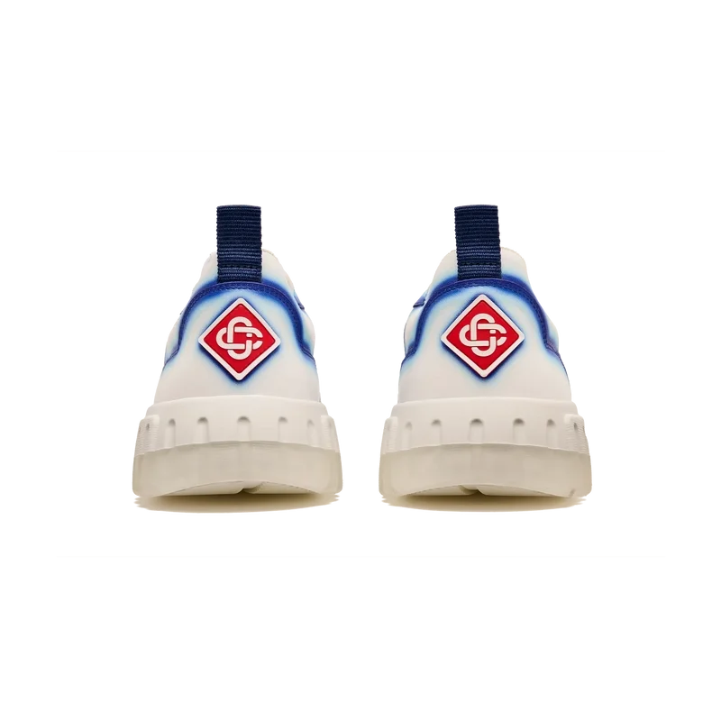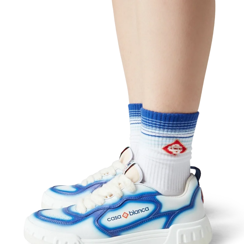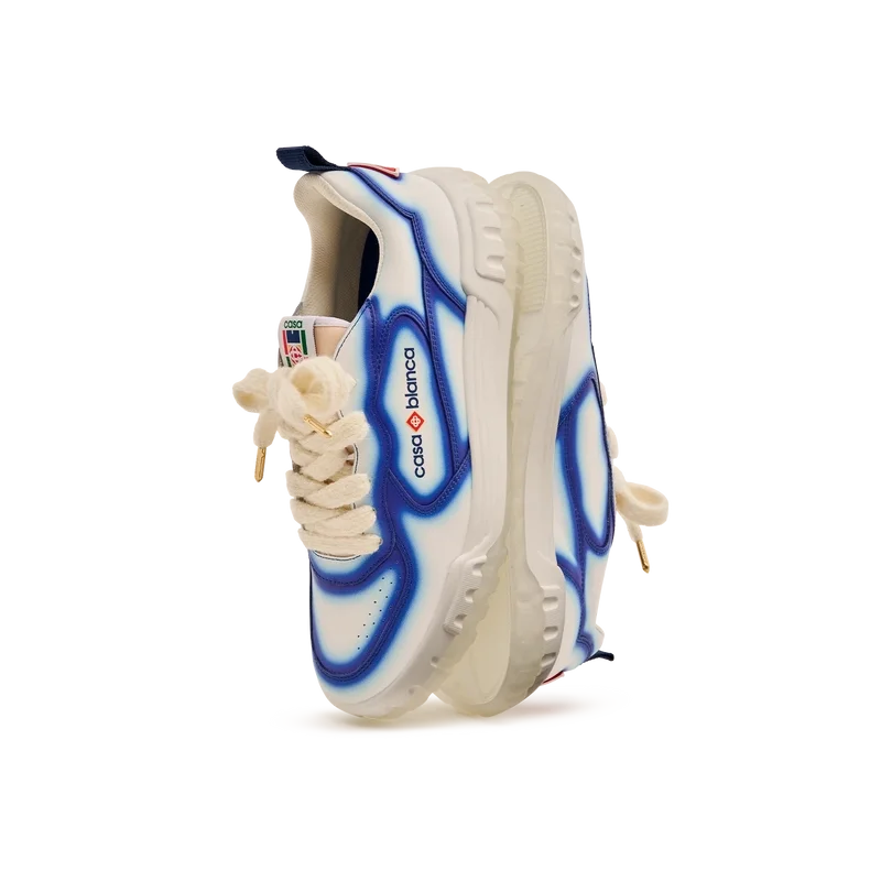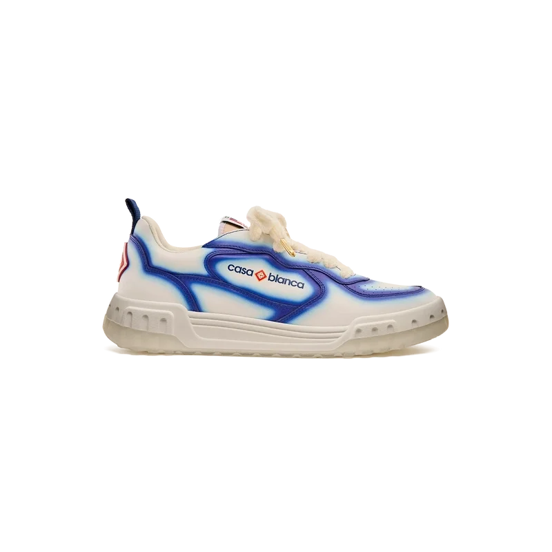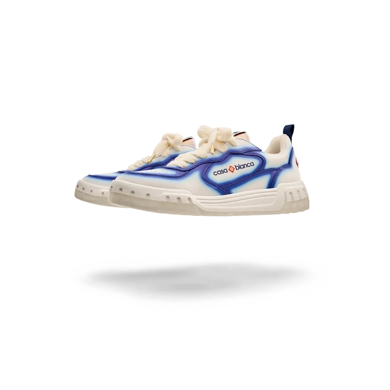 De ontwerptaal van de Court Sneaker weerspiegelt de iconische silhouetten van de jaren 90. De kleuren op de rubberen zool zijn een combinatie van de verfijnde codes van tennis en klassieke architectuur en creëren een uniform kleurenpalet over de hele schoen, waarbij de nadruk ligt op primaire kleuren die worden gecompenseerd door tenniswit om een sportief kleurverhaal te creëren. Het bovenwerk van de schoen is voorzien van geïntegreerde, vloeiende paneellijnen als knipoog naar de iconische silhouetten van de jaren 90. De prominente Casablanca-branding is overal duidelijk zichtbaar, inclusief het kenmerkende diamantmotief van het merk op de hiel, de siliconen woordmarkering op de zijkant en het geweven tonglabel en de binnenzool met tennisbaanmotief, waaraan de schoen zijn naam, de Court, te danken heeft.
