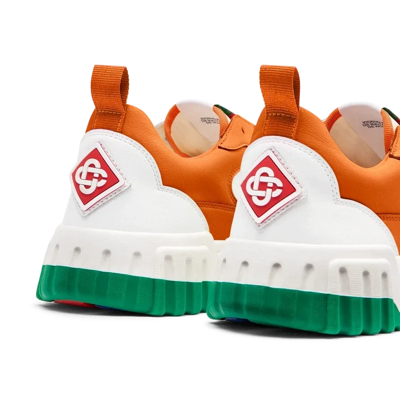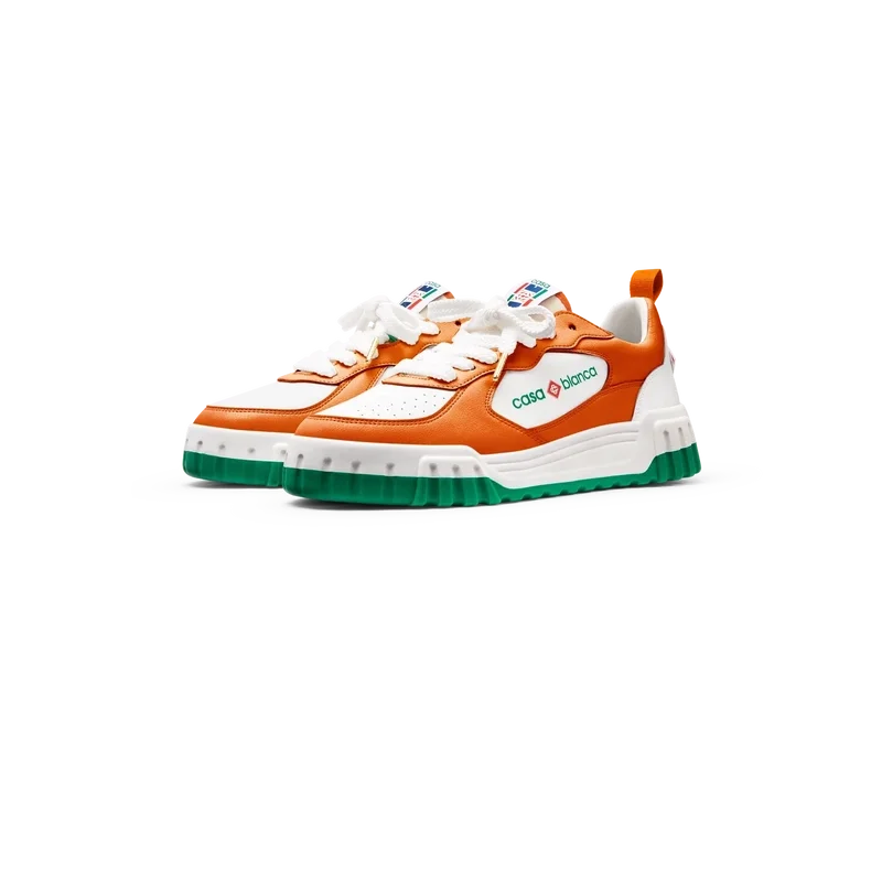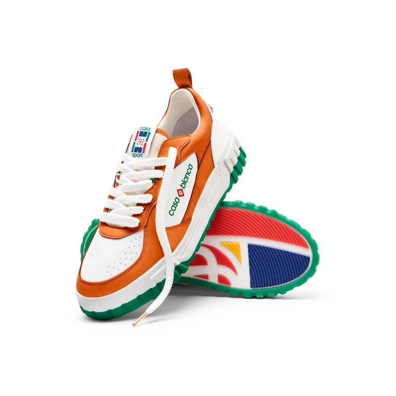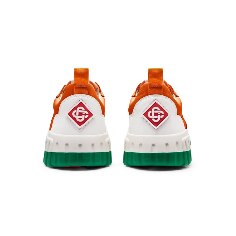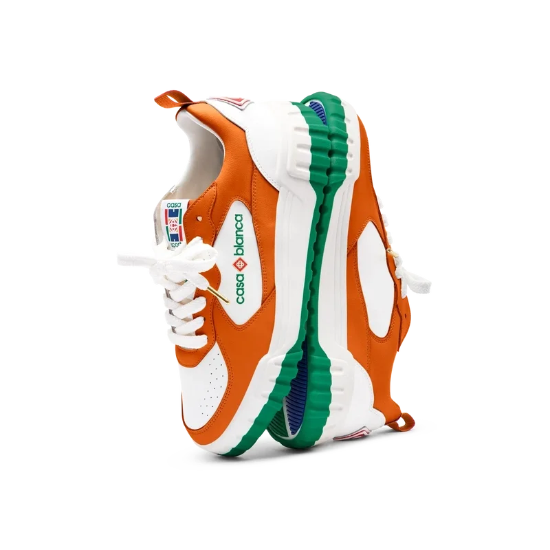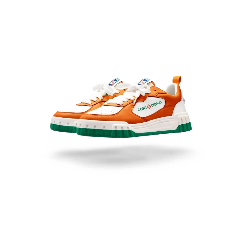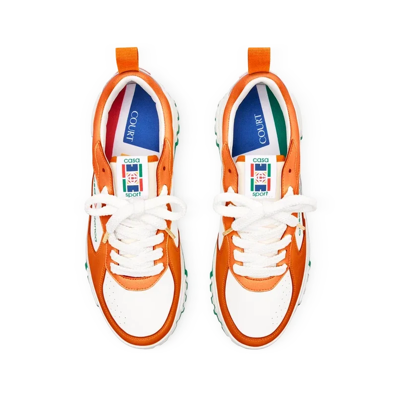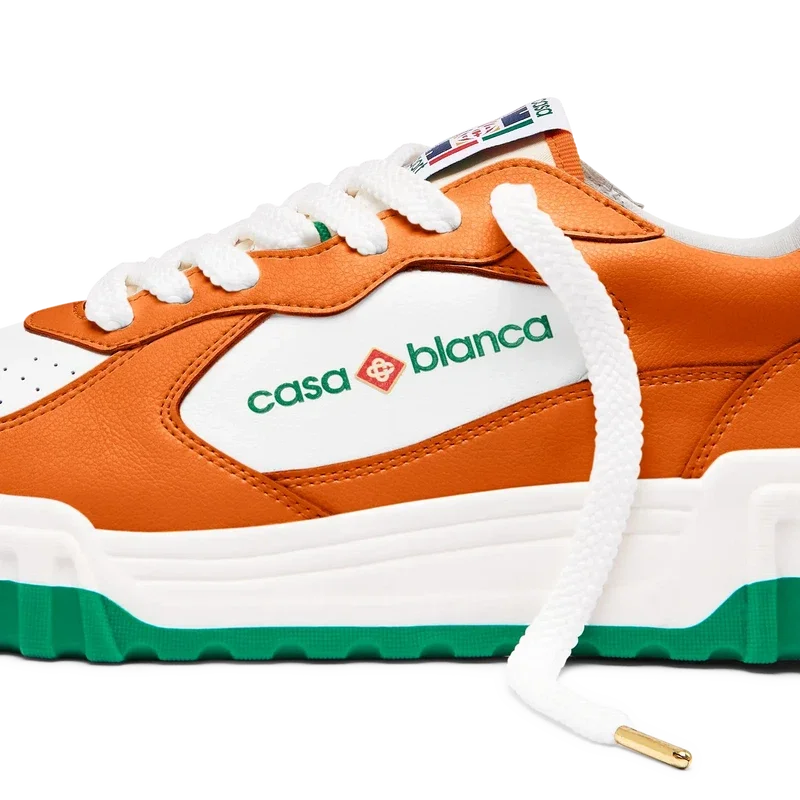 De prominente Casablanca-branding is overal zichtbaar, inclusief het kenmerkende diamantmotief van het merk op de hiel, de siliconen woordmarkering op de zijkant en het geweven tonglabel en de binnenzool met tennisbaanmotief, waaraan de schoen zijn naam, de Court, te danken heeft.