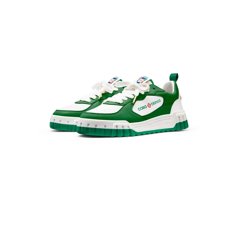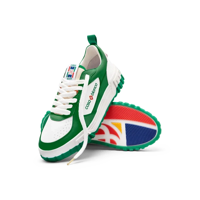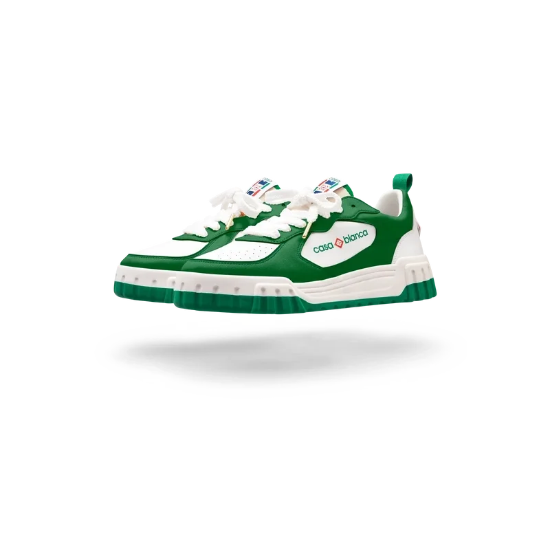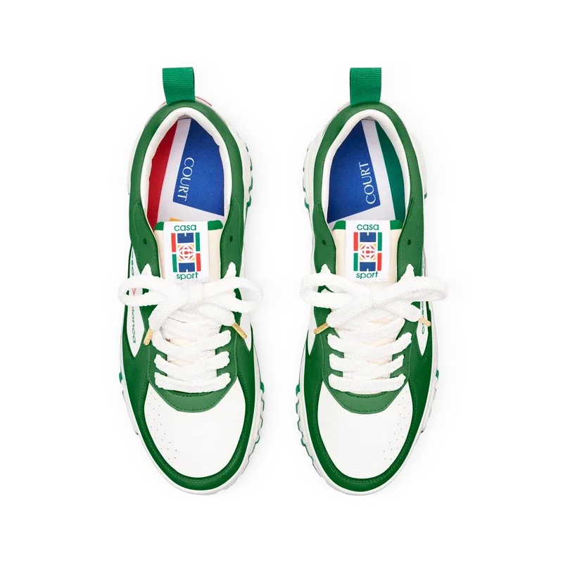 Het bovenwerk van de schoen heeft geïntegreerde, vloeiende paneellijnen als knipoog naar de iconische silhouetten van de jaren 90. De prominente Casablanca-branding is overal zichtbaar, inclusief het kenmerkende diamantmotief van het merk op de hiel, de siliconen woordmarkering op de zijkant en het geweven tonglabel en de binnenzool met tennisbaanmotief, waaraan de schoen zijn naam, de Court, te danken heeft.