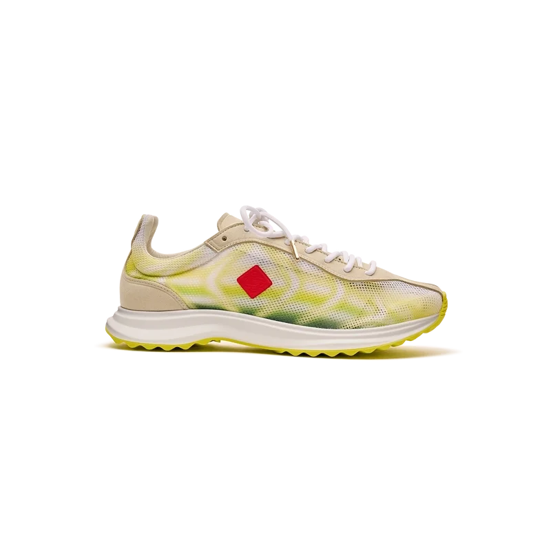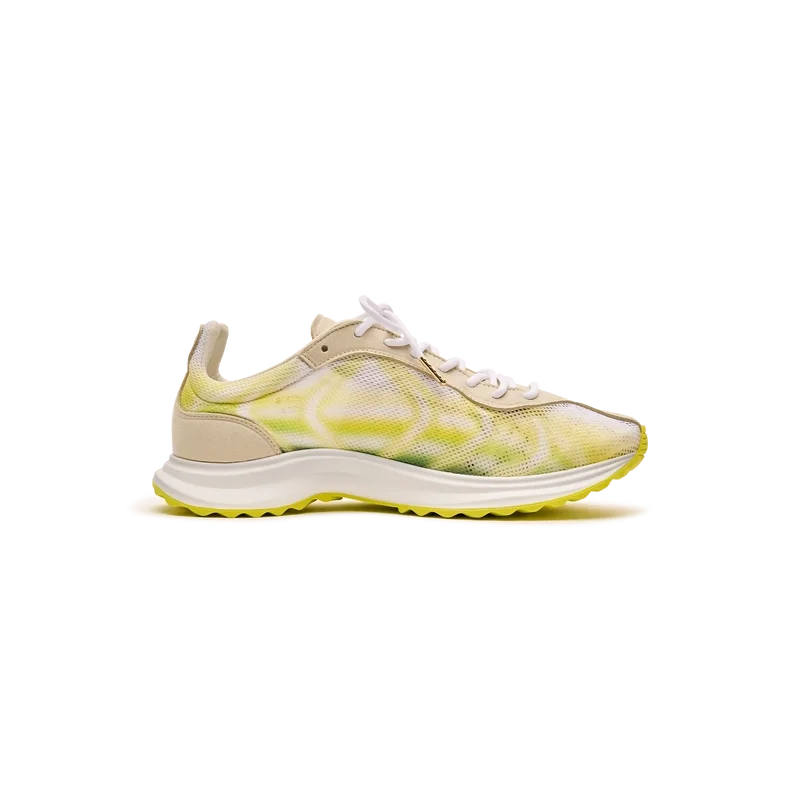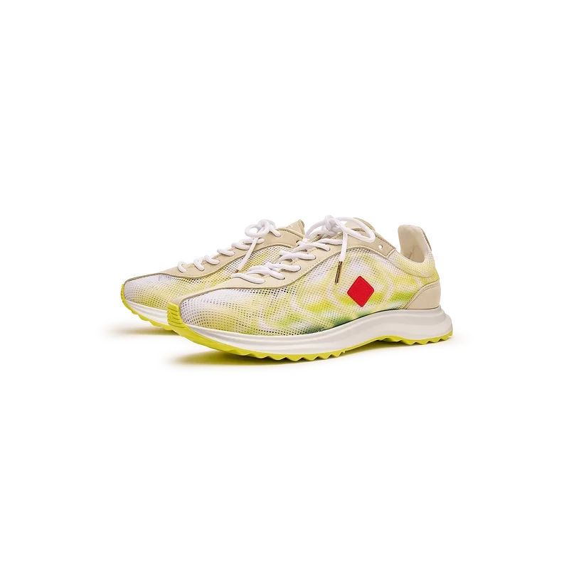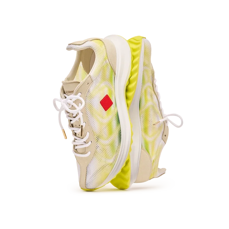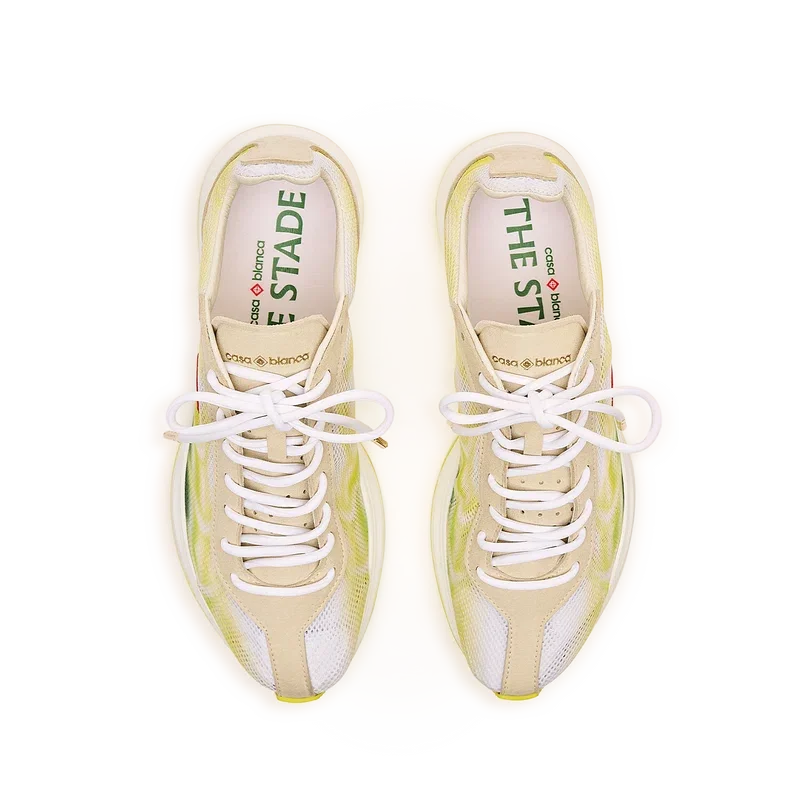 De Stade Green sneaker voor dames ontleent zijn naam aan de oude Griekse maat voor de afstand van een hardloopwedstrijd, wat later het woord voor stadion werd. Het model is geïnspireerd op prestatiegerichte hardloopschoenen en is een overbrenging van moderne technologie vanuit een oude traditie, waarbij de codes van het moderne hardlopen met het lichtgewicht mesh en de glow-print bijdragen aan de moderniteit. De zool heeft gebeeldhouwde rondingen, een verwijzing naar onze Atlantis-schoen en een vast onderdeel van het Casablanca-ontwerp.