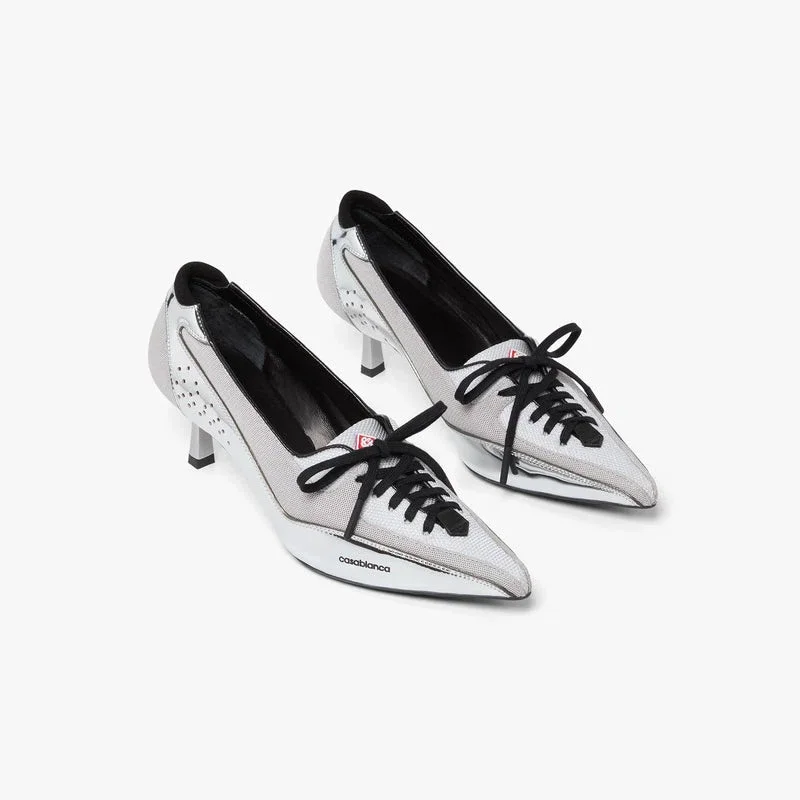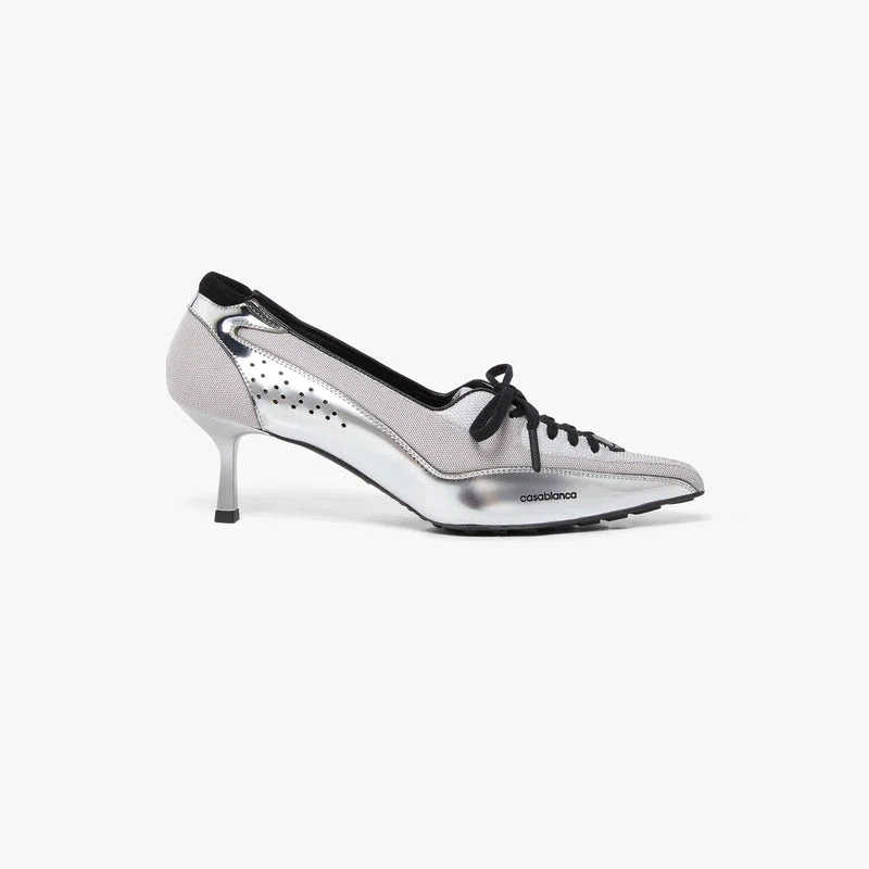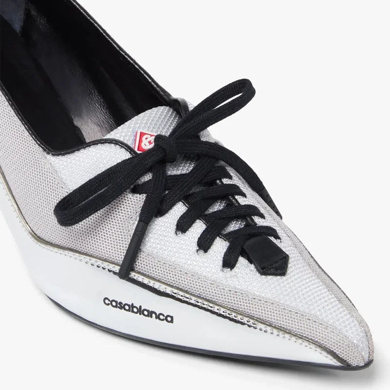 De zilveren leren sneakerpumps met hak hebben een verfijnd ontwerp en kenmerken een innovatieve fusie van sneaker- en pump-silhouetten. Afgewerkt met vetersluiting, een bovenwerk van leer en textiel, en een slanke kittenhak die de verfijnde benadering van het huis ten aanzien van eigentijdse schoenen belichaamt.