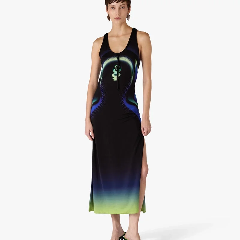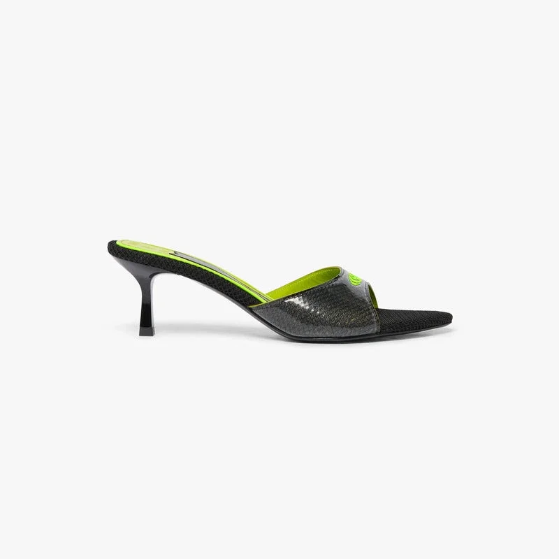 De zwarte muiltjes met hak hebben een verfijnd ontwerp zonder achterkant en zonder bandjes, met een elegant open teen. Afgewerkt met het Warped-logo van het huis op het bovenwerk en een slanke kittenhak die de verfijnde benadering van het huis op het gebied van zomerschoenen belichaamt.