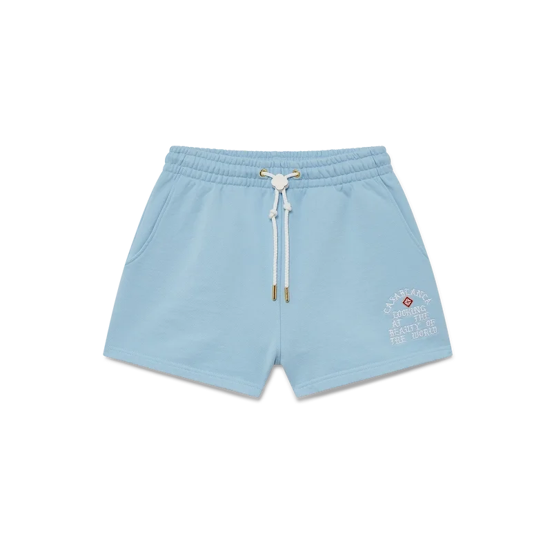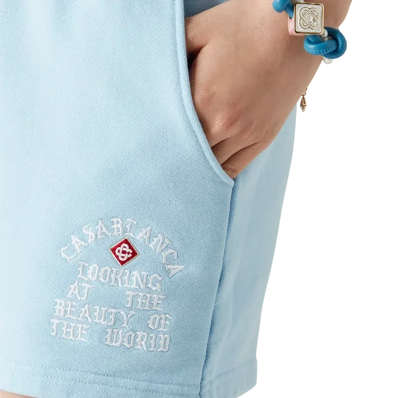 De Beauty of the World Sweatshorts zijn een sportkledingontwerp gemaakt van biologisch katoen en voorzien van het motto van het merk Casablanca in gotische typografie geïnspireerd door de straatcultuur. Afgewerkt met een elastische tailleband, een trekkoord met gouden uiteinden, schuine zijzakken en een opgestikte achterzak.