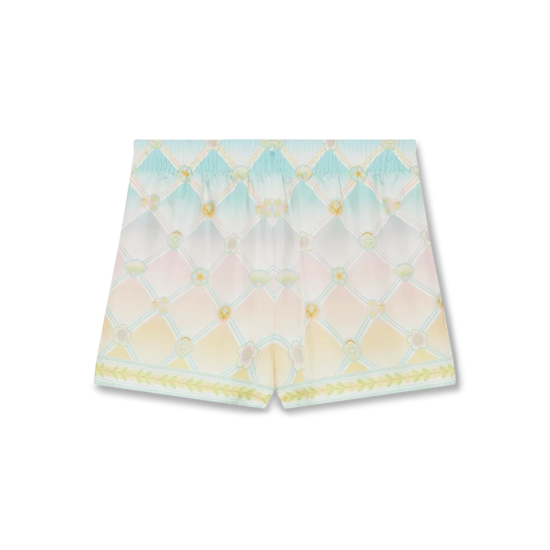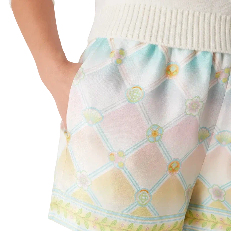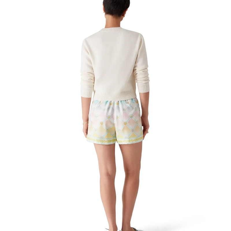 De Candy Icons zijden twill Shorts hebben een all-over print en zijn gemaakt van zijden stof met het Candy Icons-patroon, dat is ontworpen met pasteltinten en onze kawaii-iconen in gedachten. Het is een herhalend patroon met een kleurverloop. Dit patroon komt zowel in de heren- als de damescollectie voor. Afgewerkt met een elastische tailleband, trekkoordsluiting, steekzakken, een opgestikte achterzak en zoomdetails met het laurierblad-motief van het huis.