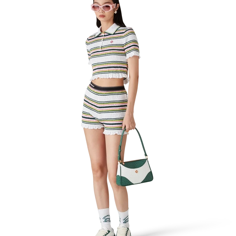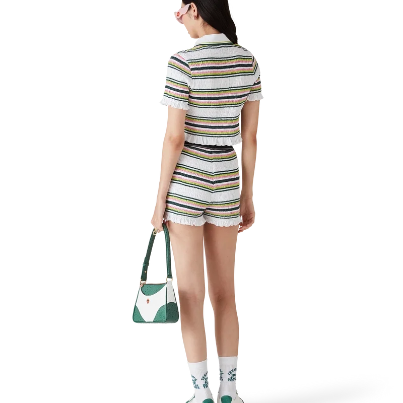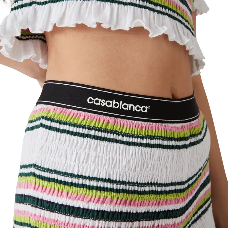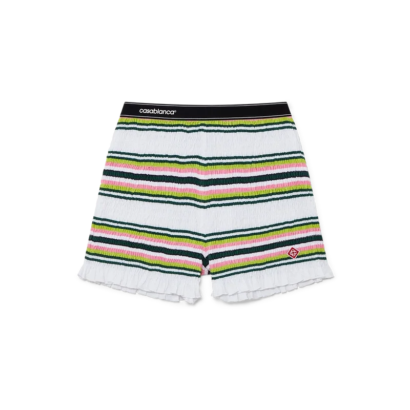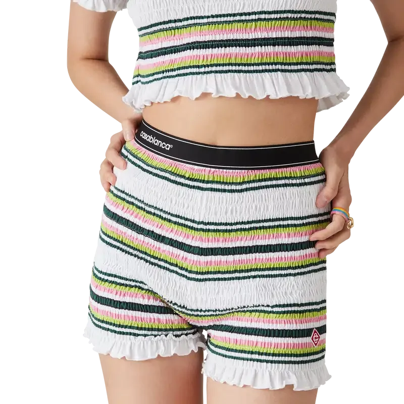 De Stripe Shirred Shorts zijn een korte broek gemaakt van gerimpelde katoenen stof met het kenmerkende diamantlogo van het huis. Afgewerkt met een elastische tailleband met het Casablanca-logo en randdetails, en ruches aan de zoom.