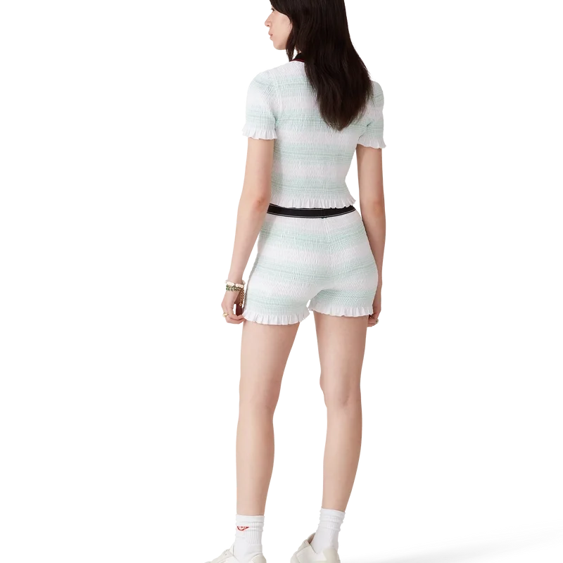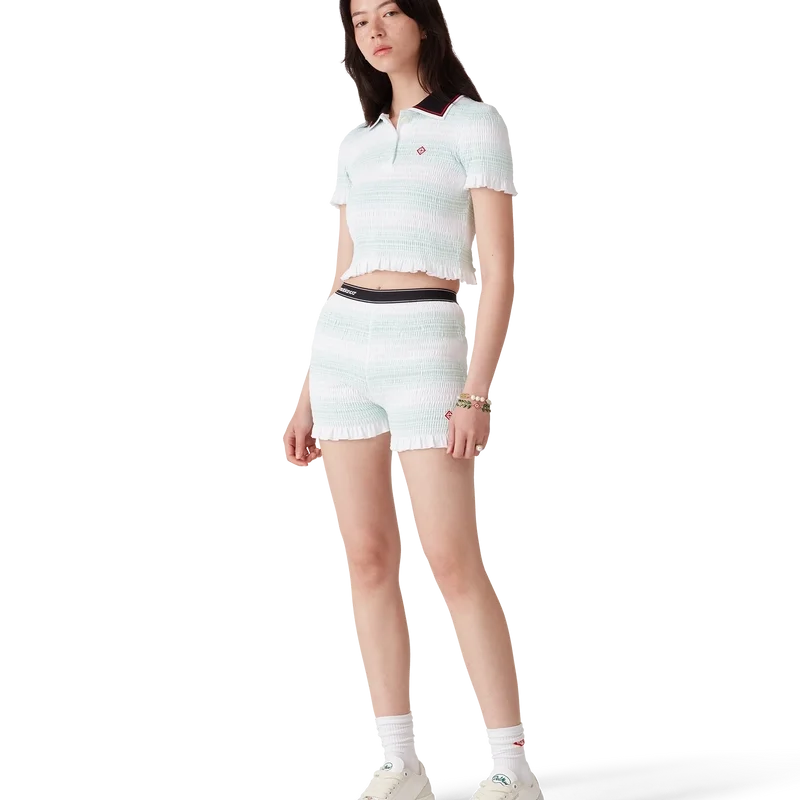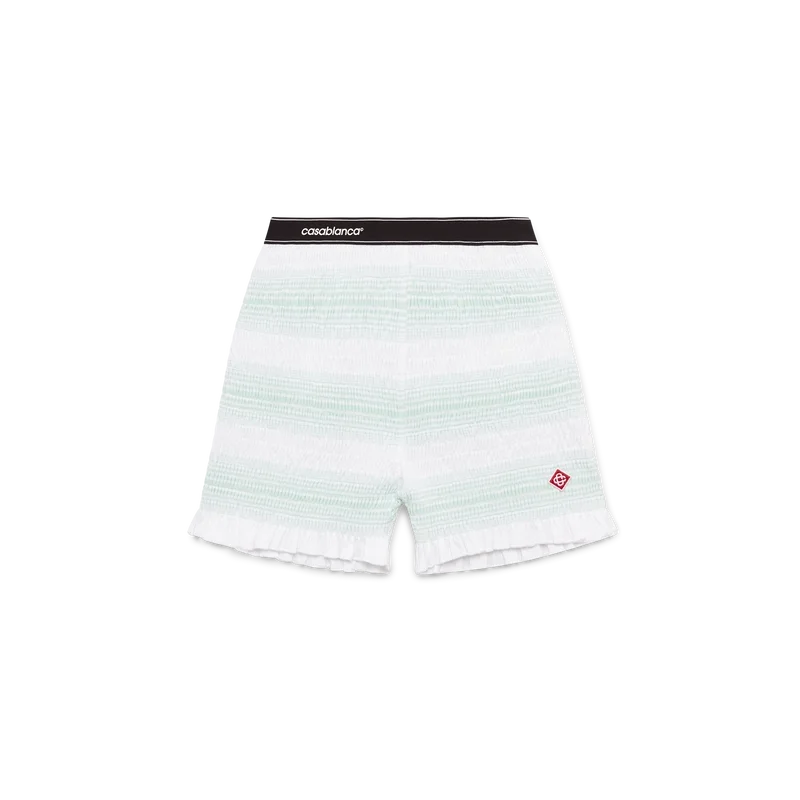 De gestreepte gerimpelde short is een kort model gemaakt van gerimpelde katoen met het kenmerkende diamantlogo van het huis. Afgewerkt met een elastische tailleband met het Casablanca-logo en randdetails, en ruches aan de zoom.