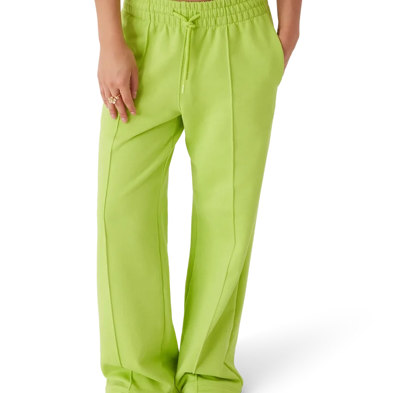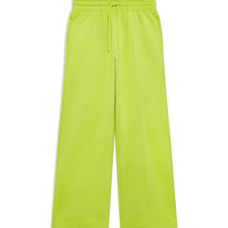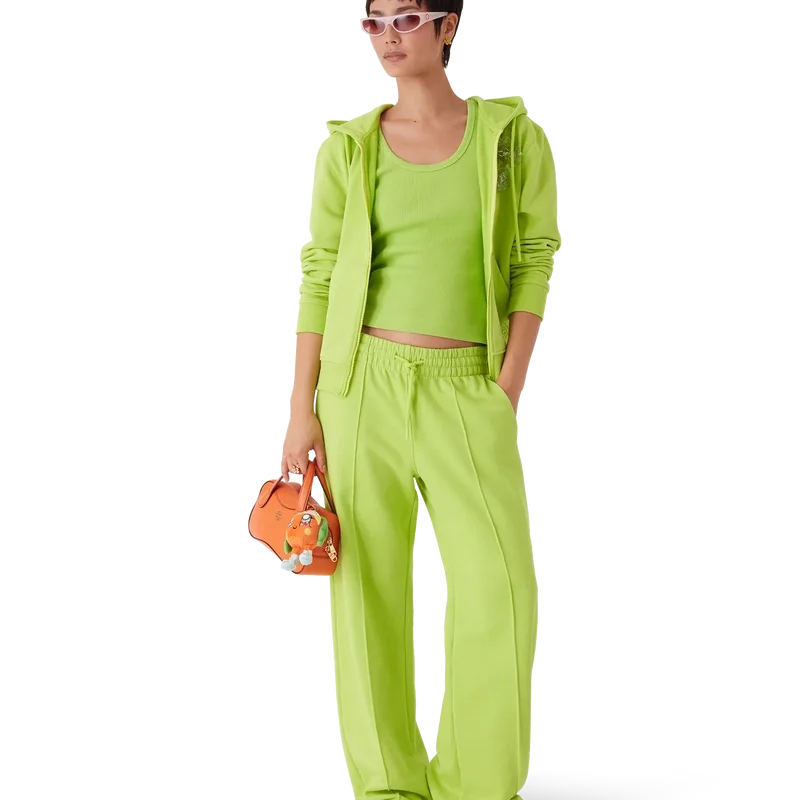 De joggingbroek met open zoom is een sportief ontwerp, gemaakt van biologisch katoen in limoengroen met twee afneembare bloemenbroches. Afgewerkt met een elastische tailleband, trekkoordsluiting, plooien aan de voorkant, steekzakken en een opgestikte achterzak met Diamond Monogram-borduurwerk.