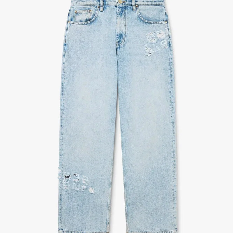 De lichtgewassen graffiti-denimjeans heeft een rechte pijp en is voorzien van het Casablanca-logo van het huis in een graffitistijl die in de stof is gegraveerd. Afgewerkt met vergulde hardware, riemlussen, voor- en achterzakken, een leren patch met merklogo en ritssluiting.