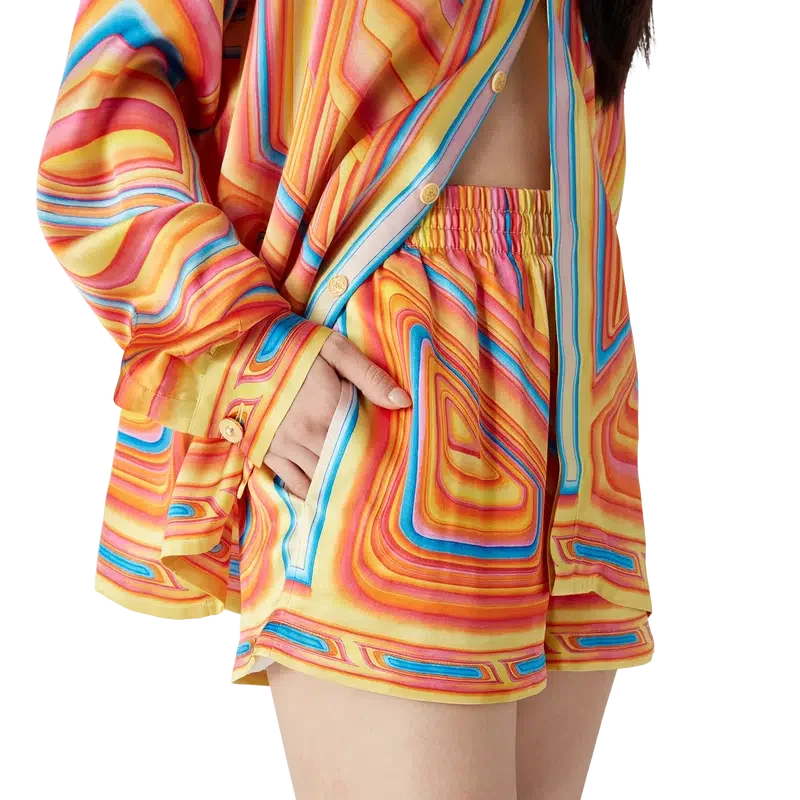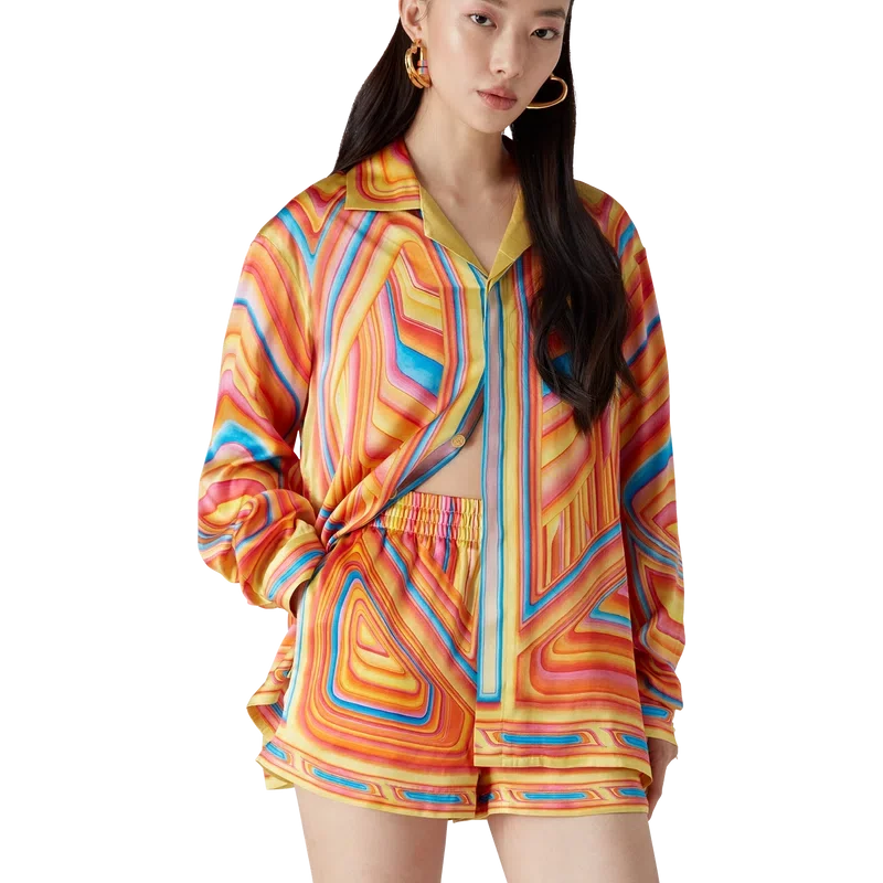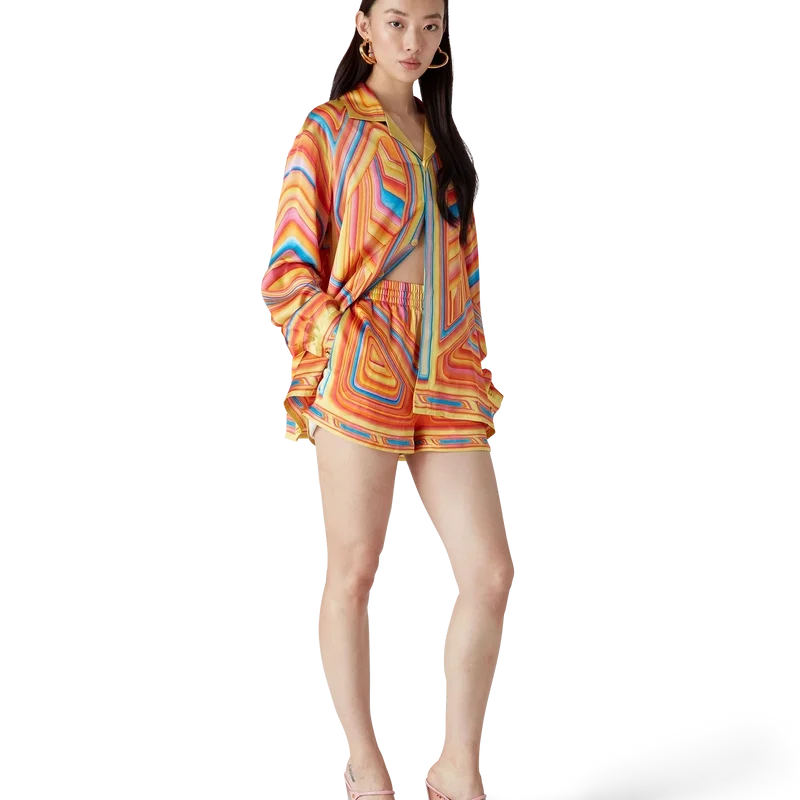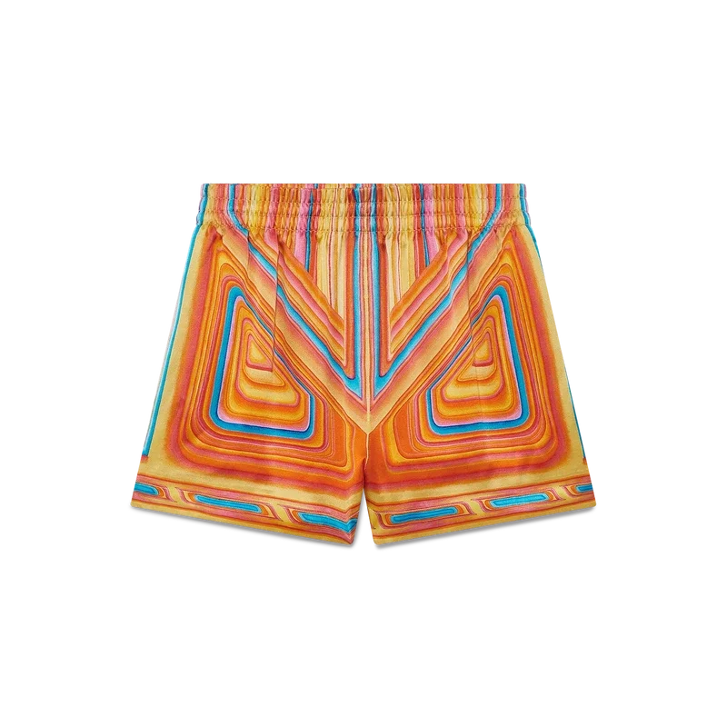 De Low Rider zijden short heeft een all-over print en is gemaakt van zijden satijn. De short is voorzien van het seizoensgebonden artwork van het huis, dat verwijst naar de popkleuren en airbrush-schildertechnieken die worden gebruikt op Low Rider-auto’s, met het Casablanca-logo. Afgewerkt met een elastische tailleband, steekzakken aan de zijkant, een opgestikte zak aan de achterkant, een trekkoordsluiting en een voering.