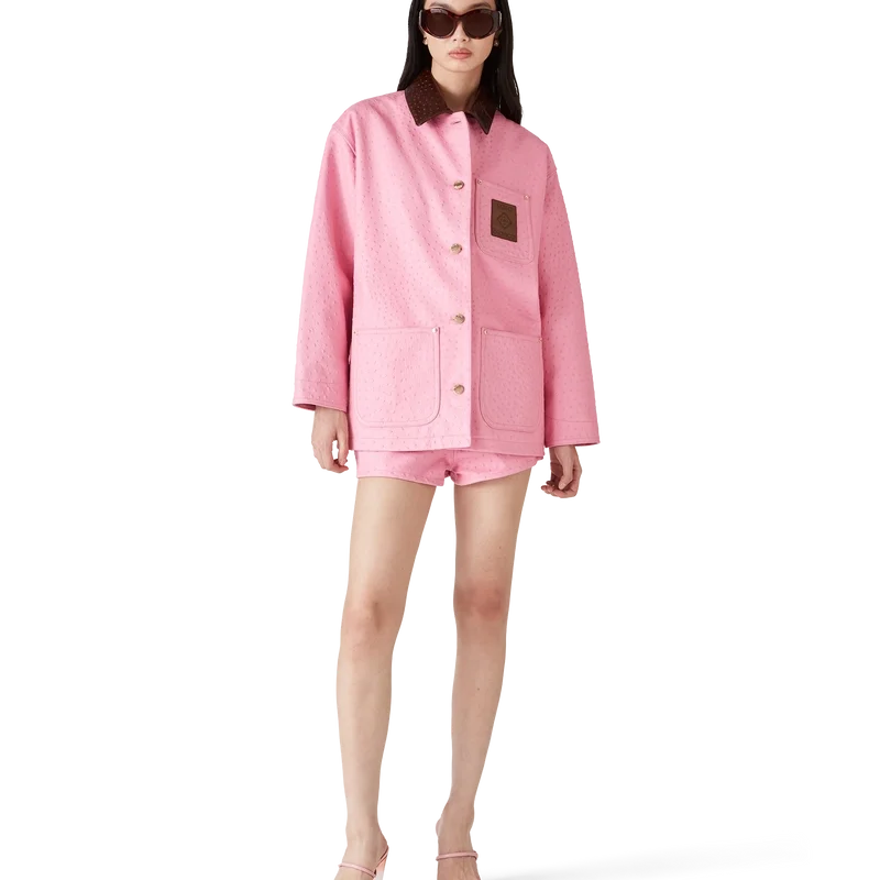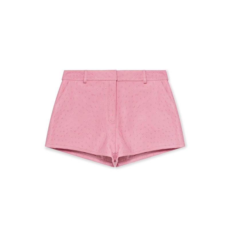 De mini-shorts van reliëfleer zijn een kort model, vervaardigd uit reliëfleer en voorzien van een print met struisvogeleffect. Afgewerkt met ritssluiting, faux klepzakken en een ritssluiting.