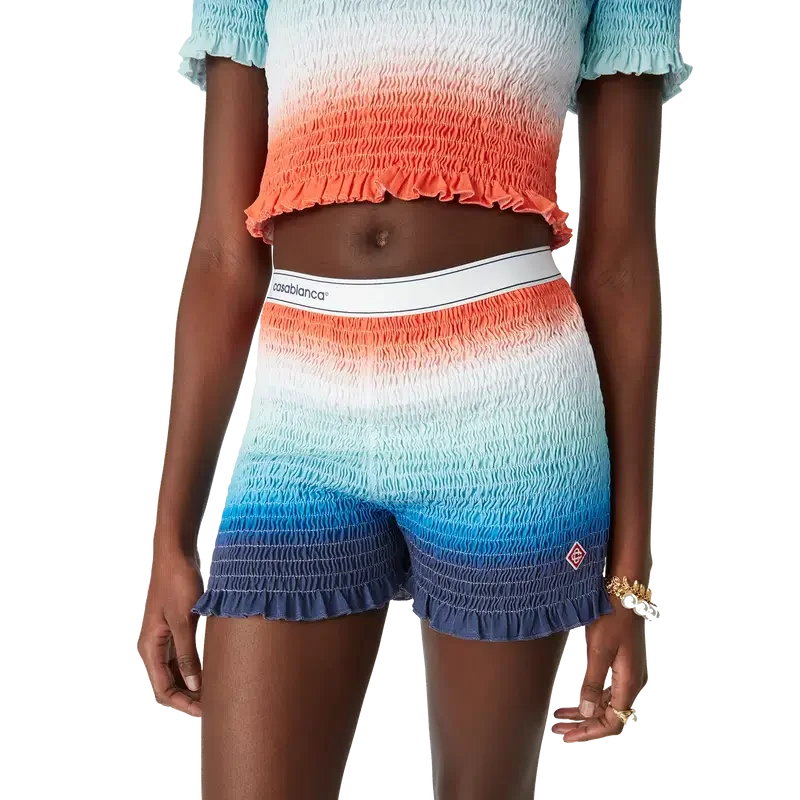 De Gradient Shirred Shorts zijn een short met all-over print, voorzien van het kenmerkende diamantlogo van het huis. Afgewerkt met een elastische tailleband met het Casablanca-logo en randdetails, en ruches aan de zoom.