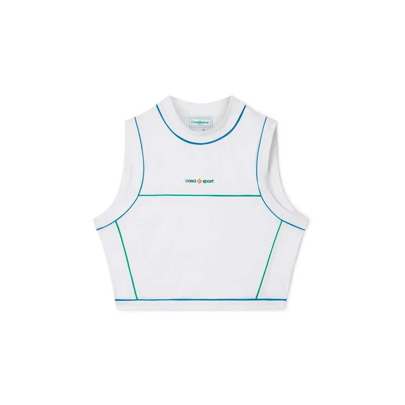 Het Casa Sport vest met hoge kraag is een mouwloos sportkledingontwerp, vervaardigd uit een poly-elastaanmix met het Casa Sport-logo op de borst. Afgewerkt met een hoge kraag en contrasterende biezen rond de hals, borst, armsgaten en taille.