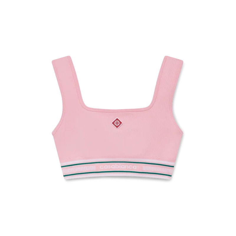 De Casablanca-bralette is een mouwloos, op sportkleding geïnspireerd ontwerp met het kenmerkende diamantlogo van het huis in het midden, vervaardigd uit een stretchstof. Afgewerkt met een elastische band met het Casablanca-logo van het huis, bandjes, paneeldetails en een ronde hals.