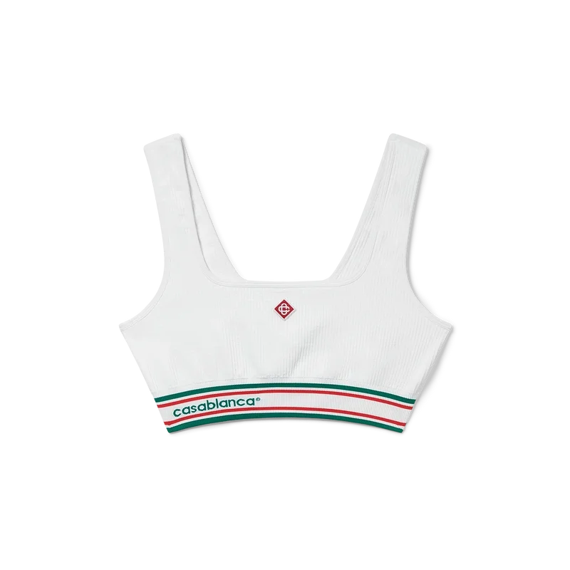 De naadloze bralette heeft een gestroomlijnd, op sportkleding geïnspireerd ontwerp met het kenmerkende tennisstreepmotief, het Casablanca-logo en een diamantvormige logopatch. Gemaakt van naadloze stretchstof, voor een verfijnd silhouet met een minimale constructie. Afgewerkt met een elastische onderband, bandjes en een ronde hals.