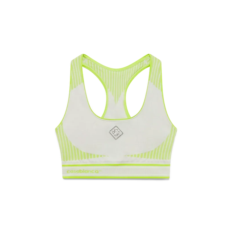 De naadloze sportbeha is een mouwloos, op sportkleding geïnspireerd ontwerp met het kenmerkende Diamond Monogram van het huis in het midden. Dit kledingstuk is vervaardigd uit een naadloze, geribbelde stretchstof met een elastische band, afgewerkt met bandjes, een racerback en een ronde hals.