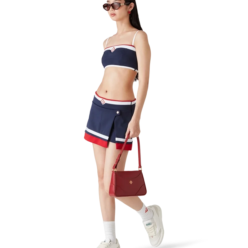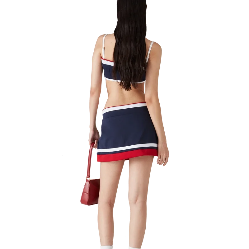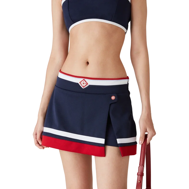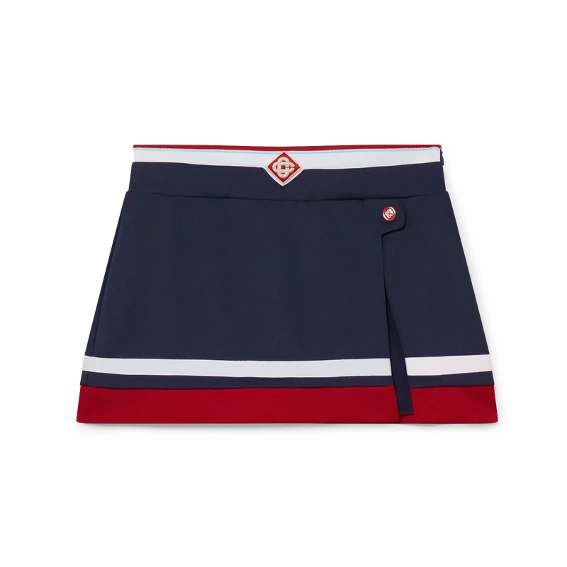 Het tricot minirok is een kort model, gemaakt van tricotstof. Afgewerkt met een tailleband met het kenmerkende diamantlogo van het huis, een ingebouwde short, een split en een ritssluiting aan de zijkant.