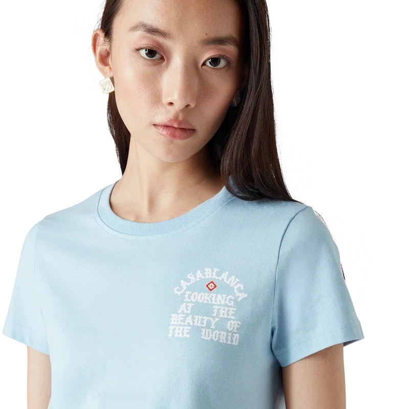 Het Beauty of the World T-shirt is een bedrukt ontwerp met korte mouwen, gemaakt van biologisch katoen en voorzien van het motto van het merk Casablanca in gotische typografie, geïnspireerd door de straatcultuur. Afgewerkt met een klassieke ronde hals en het kenmerkende diamantlogo van het huis.