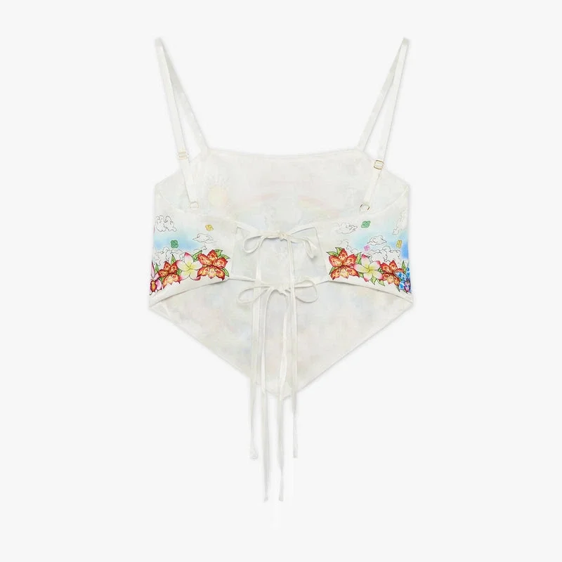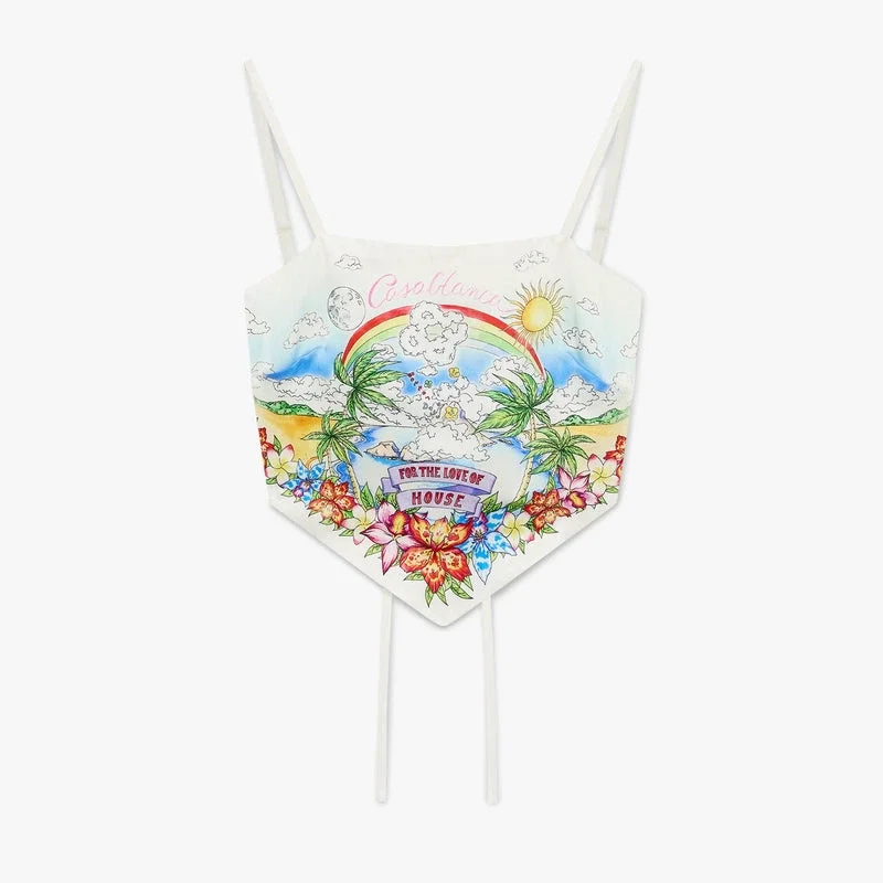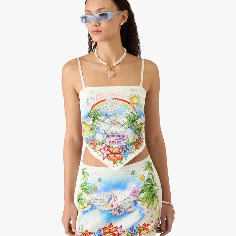 De Better Days zijden satijnen sjaaltop is een verfijnd ontwerp met de Better Days-illustratie van dit seizoen, die de utopische visie van Ibiza beschrijft als een bestemming voor een bijna religieuze ontdekkingsreis door het diverse muzikale landschap. Afgewerkt met spaghettibandjes, een strik aan de achterkant en een slank silhouet. Ontworpen om te dragen met de bijpassende minirok.