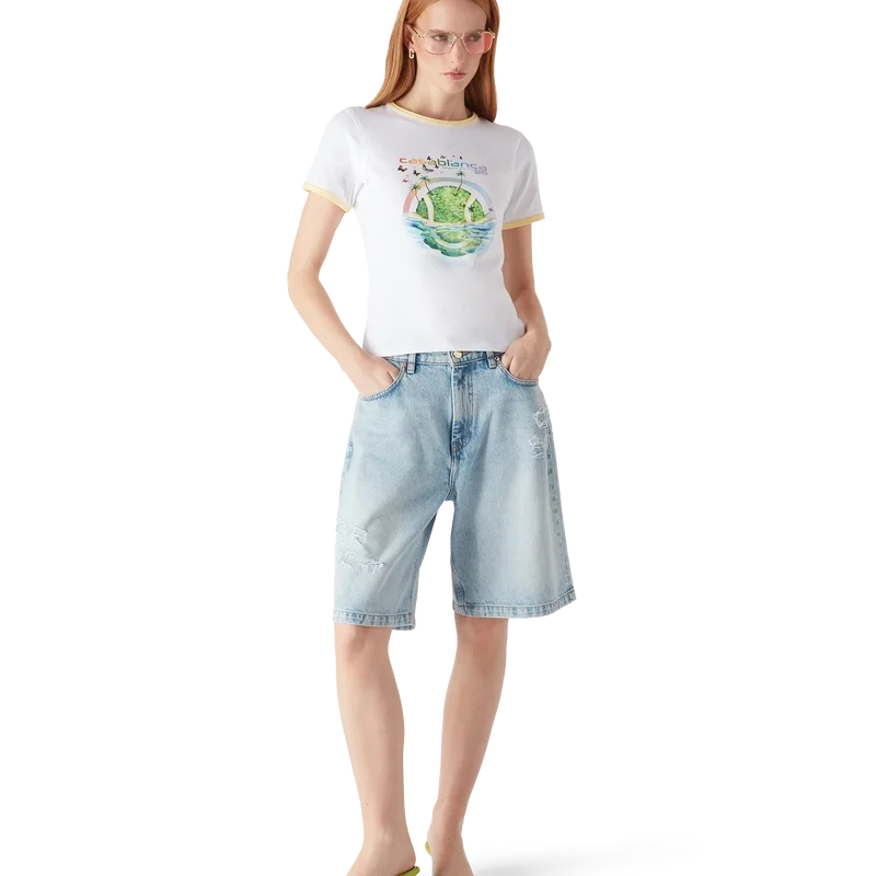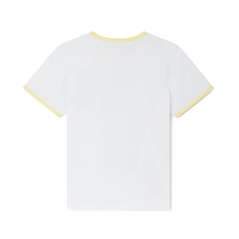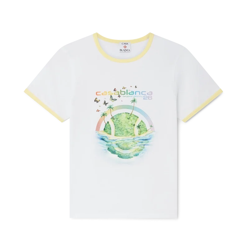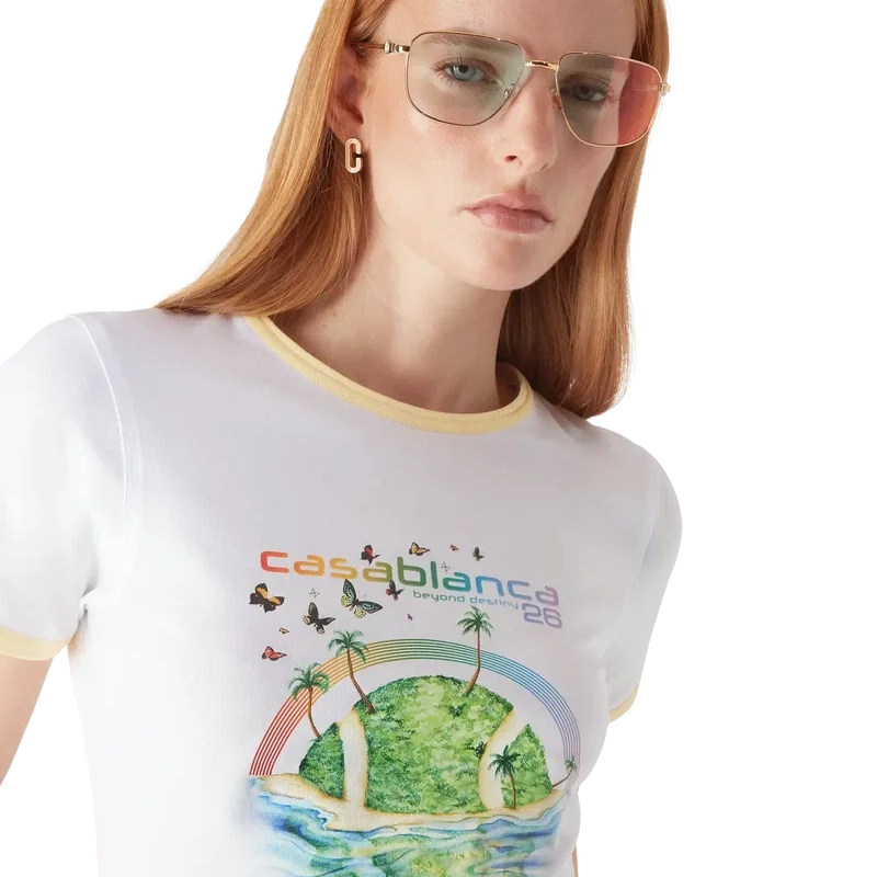 Het Beyond Destiny Longline Ringer T-shirt heeft een slank ontwerp, met de Beyond Destiny-illustratie van dit seizoen. Het maakt gebruik van halftoonverloop om diepte te creëren en is gelaagd met op videogames geïnspireerde branding voor een speelse, futuristische uitstraling. Afgewerkt met contrasterende ribdetails bij de ronde hals en manchetten, een lange zoom en het Casablanca-logo in een tekst met kleurverloop op de borst.