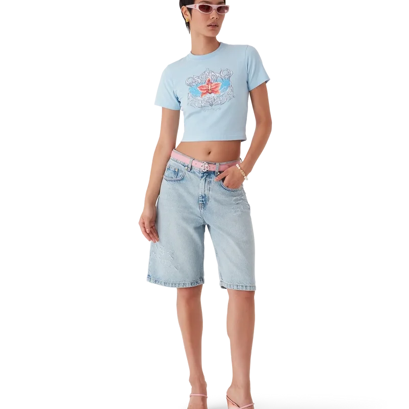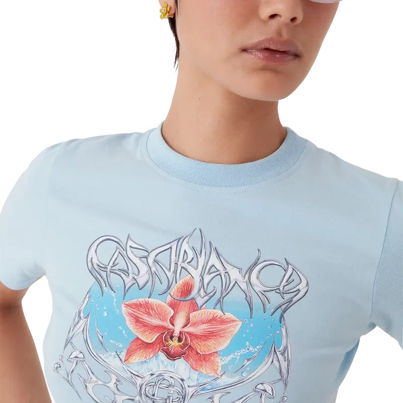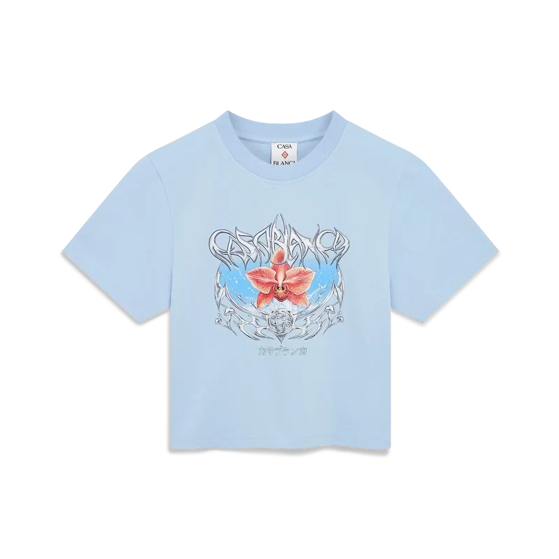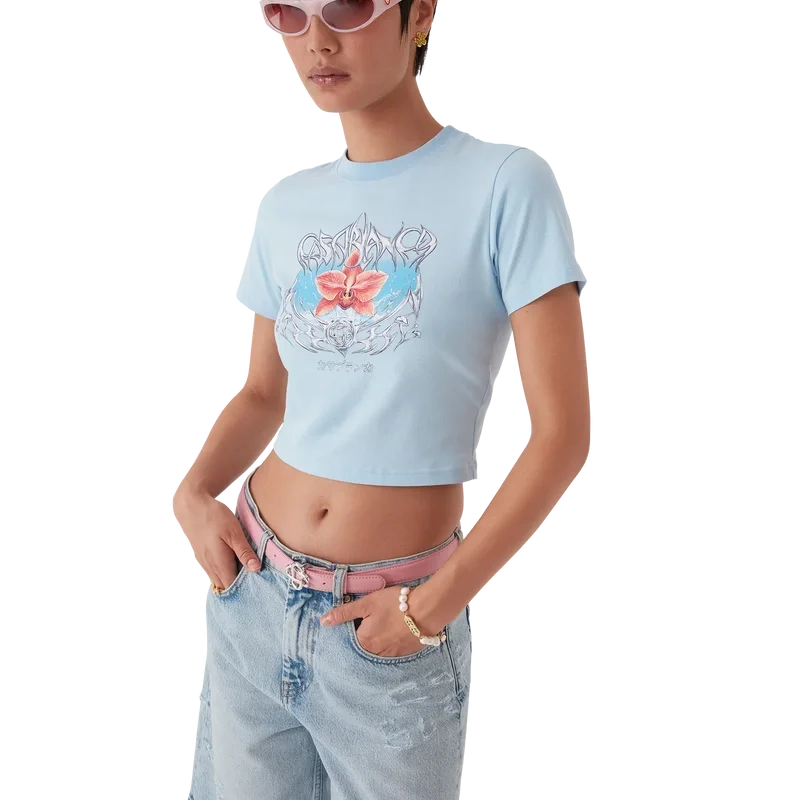 Het Blades Cropped T-shirt is een getailleerd model met een print die speelt met het contrast tussen twee tegengestelde gevoelens: de scherpte van het mes en het koude, zilveren chroom, in contrast met de warmte van de natuur, zoals de opvallende roze en rode tinten van een orchidee. De toevoeging van water geeft het ontwerp een fris, helder element. Afgewerkt met een klassieke ronde hals.