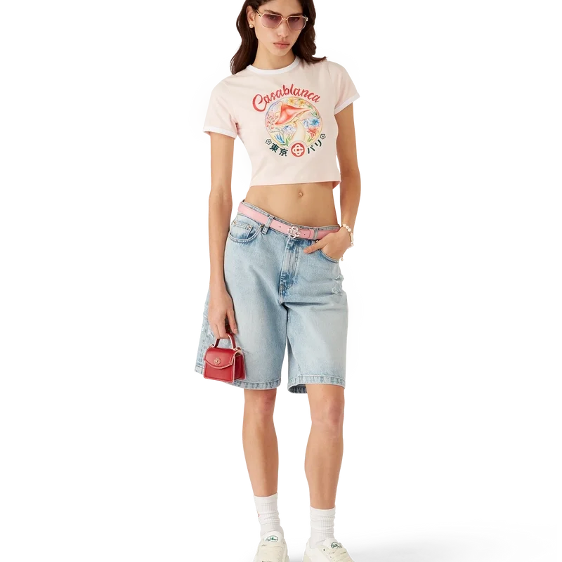Het cropped T-shirt met paddestoelembleem is een ontwerp met korte mouwen en een van de kenmerkende ontwerpelementen van het huis: de paddestoel. Het is gemaakt van Pima-katoen en heeft een klassieke ronde hals. Ontworpen om boven de navel te vallen.