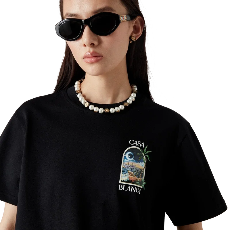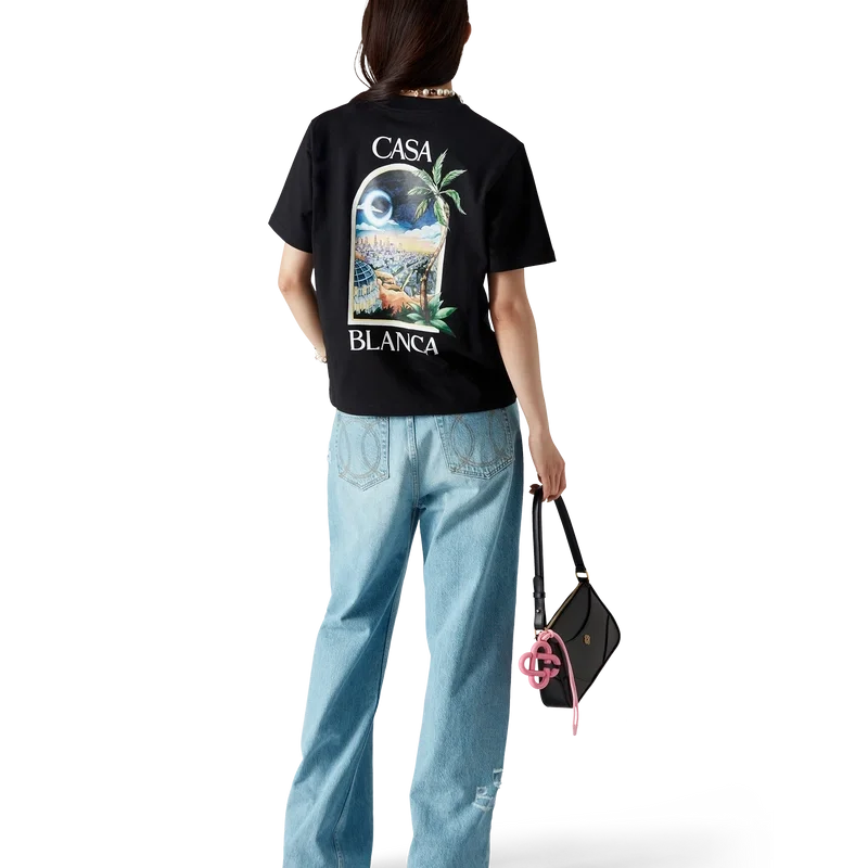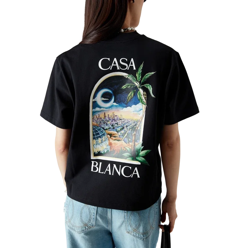 Het La Nights T-shirt is een T-shirt met korte mouwen en print, gemaakt van biologisch katoen en voorzien van een kenmerkende afbeelding die een venster op een nachtelijk landschap in La vertegenwoordigt. Afgewerkt met een klassieke ronde hals.