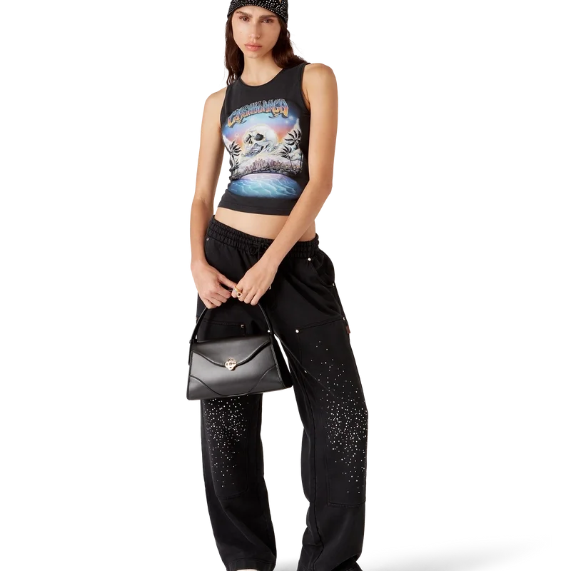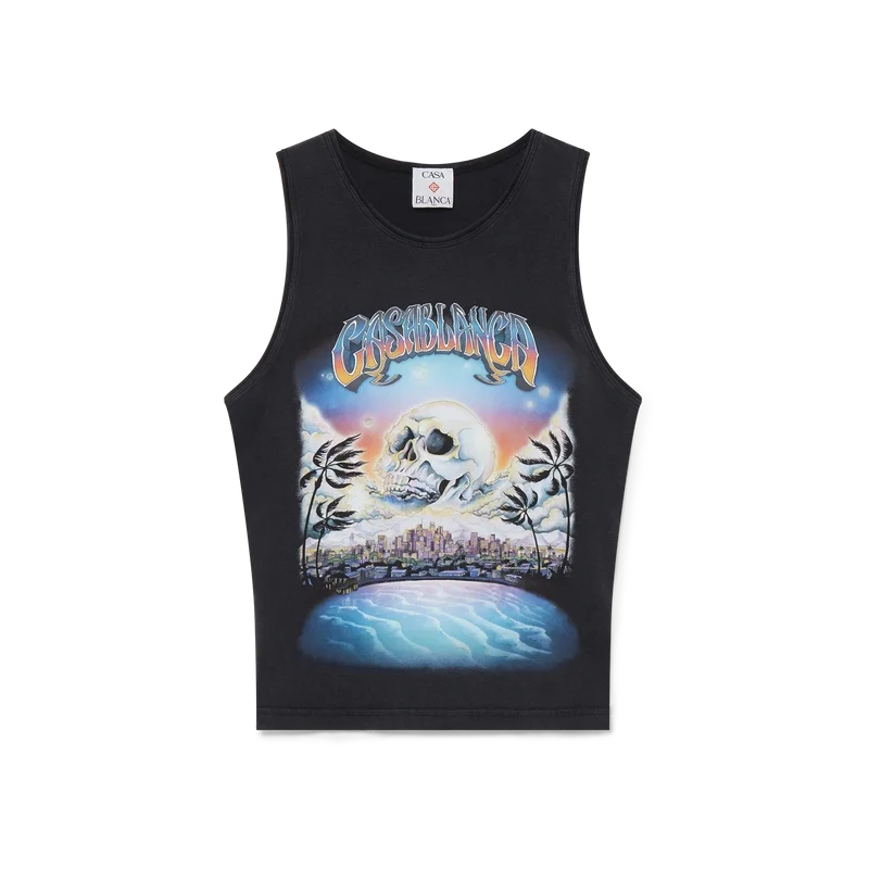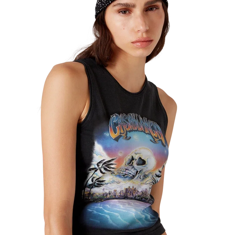 De La Pramonition Cropped Tank Top is een mouwloos shirt met print, gemaakt van bedrukte katoen met seizoensgebonden kunstwerk geïnspireerd op een griezelig beeld van de skyline van LA bij nacht, met UFO-elementen die verwijzen naar vintage sci-fi-inspiratie. Afgewerkt met een klassieke ronde hals. Ontworpen om boven de navel te vallen.