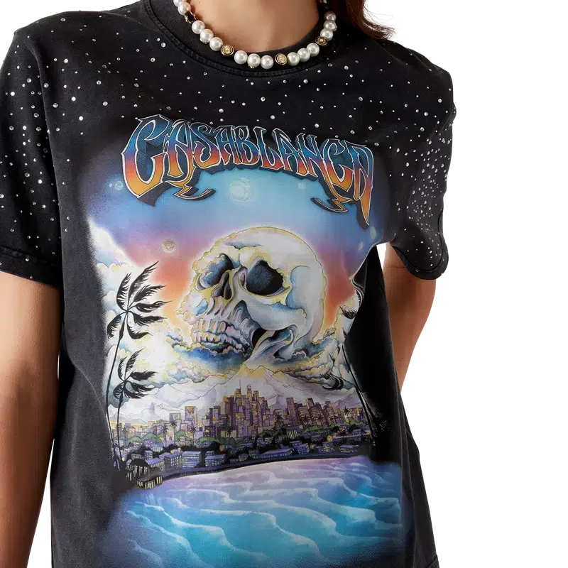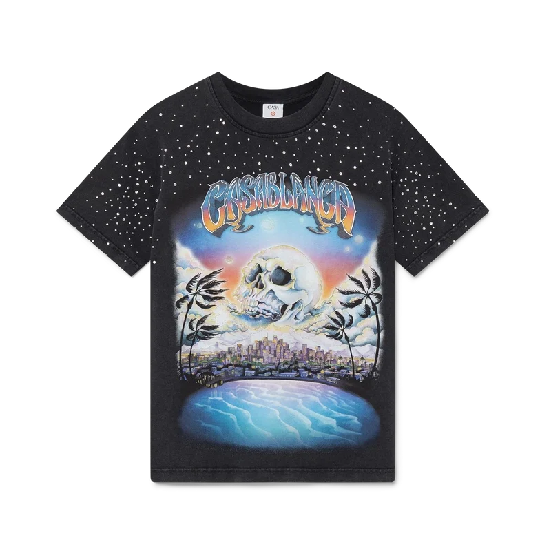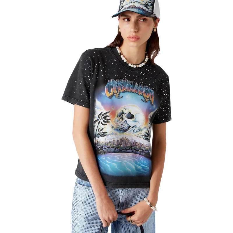 Het La Pramonition T-shirt met kristallen versiering is een ontwerp met korte mouwen, vervaardigd uit bedrukte biologische katoen met de kunst van dit seizoen. Het is geïnspireerd door een griezelig visioen van de skyline van La bij nacht, met UFO-elementen die verwijzen naar vintage sci-fi-inspiratie. Afgewerkt met een klassieke ronde hals.